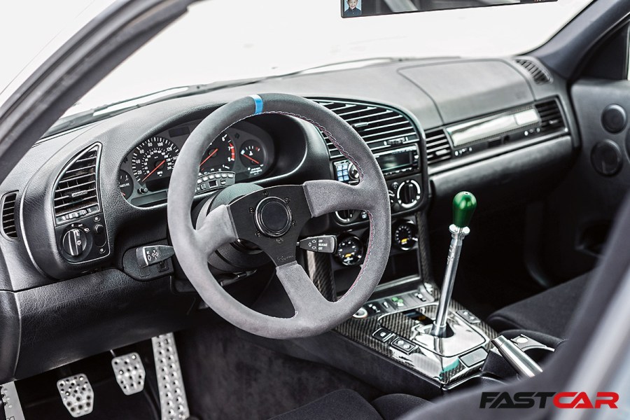The carbon airbox dominates the engine bay, and it’s pretty much the rule that if you’ve got an S54 and aren’t adding forced induction into the mix, you’ve got to have a CSL-style airbox on there because the induction noise will change your life. With the combination of an E46 M3 mid-section and an Eisenmann Race silencer, Alex’s E36 is making all the right noises and delivers plenty of performance.