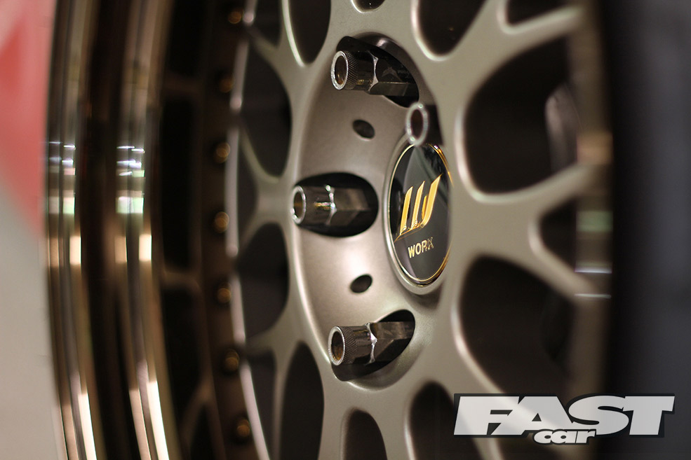 9x19in ET25 (front) and 11x19in ET33 (rear) WORK VS-XX wheels with anodised bronze dishes; gold plated bolts and matt bronze centres; 225/35 (f) and 265/30 (r) Toyo Proxes T1 Sport tyres; Air