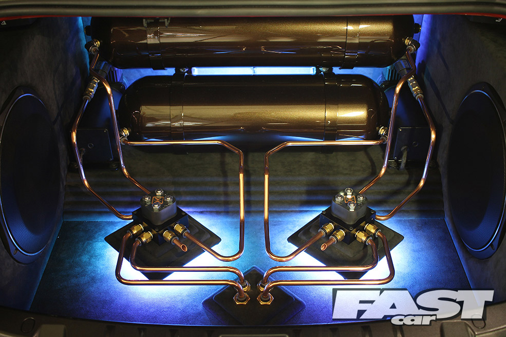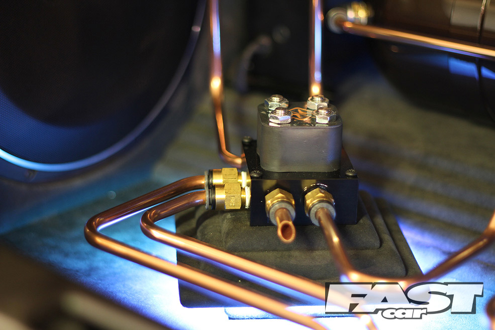 “My overriding vision for the install was symmetry; the usual route would be the AccuAir VU4 manifold which controls four airbags, but I wanted to be different and put more effort into using two VU2 manifolds which control two each (ie one manifold controls the front axle and the other controls the rear). The main purpose was to have two manifolds and thus be symmetrical. The system’s wiring loom was modified by me and a friend, and The Install Company took it a step further by performing a ‘plug delete’ on both manifolds which removes the plug-and-play connector, in the interest of aesthetics and guaranteed symmetry!”