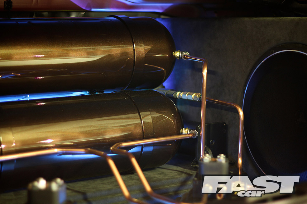 This gives us a neat segue into the boot install, as it really is a work of art. Az’s own design, it was crafted by the experts at The Install Company, featuring custom-painted air tanks, dual Viair 444c compressors, copper hardlines and LED lighting in a fabulous showcase of form-meets-function. “The BMW Pyrite Bronze Metallic was chosen to match the bronze wheels,” he explains.