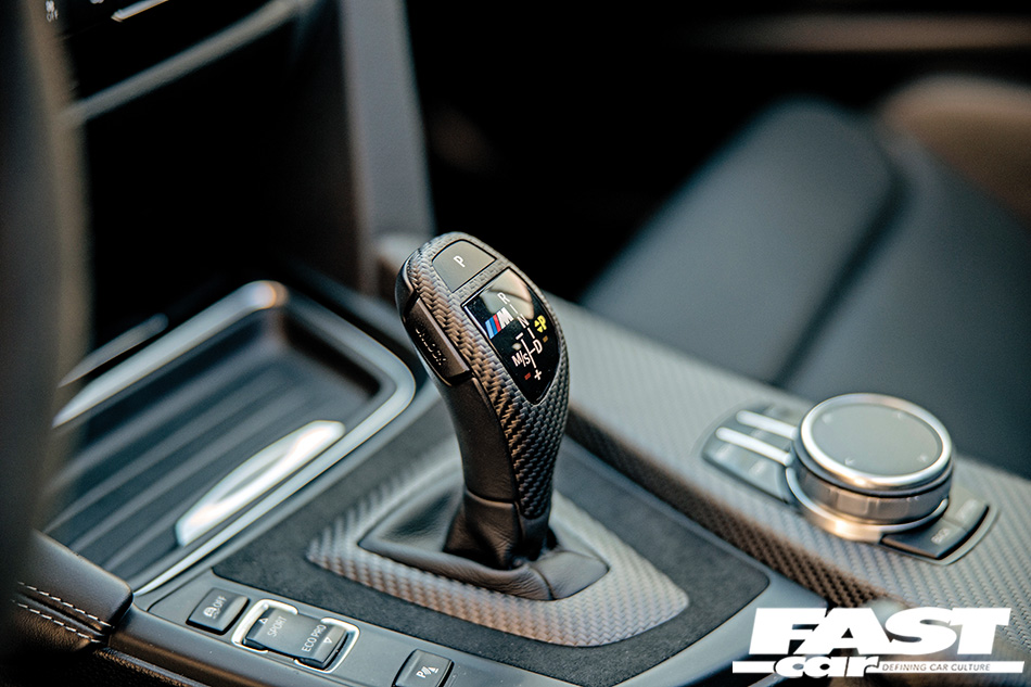 Recaro Sportster CS seats in leather, 3DDesign paddle-shift, NBT Evo ID6 retrofit, Brey-Krause seat brackets for OEM electric sliders, BMW M Performance carbon/Alcantara armrest, shifter and