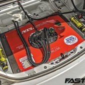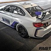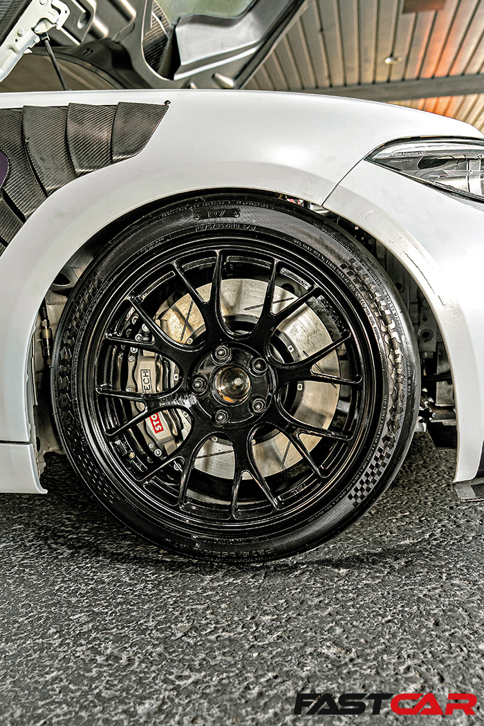 10×18” (front and rear) Forgeline wheels with 275/35 Hoosier slicks, Motion Control Suspension 4W four-way coilovers, Ground Control adjustable top mounts, StopTech lightweight BBK with six-piston calipers (front) and four-piston calipers (rear)