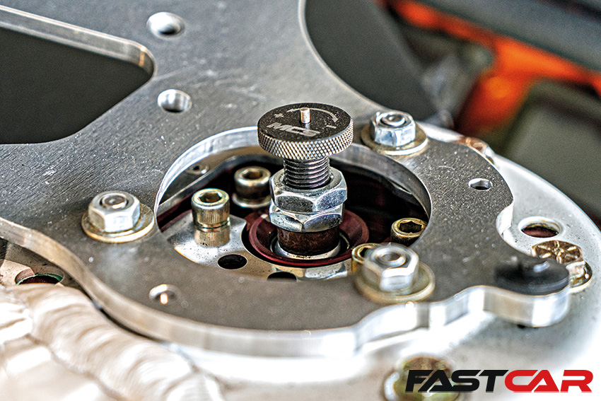 The wheels are lightweight Forgeline 18s, finished in gloss black, measuring 10” across front and rear and wrapped in seriously wide Hoosier slicks, and behind the spokes, you will spy the lightweight StopTech BBK that’s been fitted. The front setup uses six-piston calipers, and you’ll find four-pots at the rear, and they deliver monstrous stopping power lap after lap.