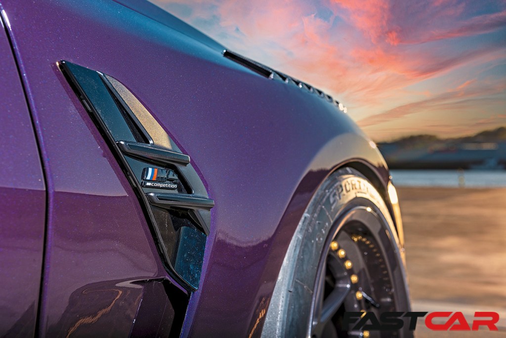 It’s the imposing exterior that gets your attention first, with that dazzling purple bodywork, but that’s no wrap. You’re looking at Individual Venetian Violet Pearl, and it’s an absolutely sublime shade of silky purple that envelopes the M4’s exterior, changing hue and intensity depending on the light, and it’s simply stunning. We said the G8x was color-sensitive, and purple is definitely a winner in a big way. But shift your gaze from the paint to the rest of the body, and you’ll see the numerous aero additions that give this M4 so much presence and muscle, and it’s with all these aggressive extras that the styling really starts to shine.