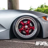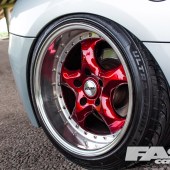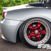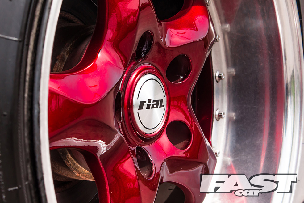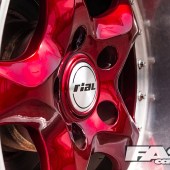 9×17 and 10×17-inch Rial Imola two-piece splits painted in custom candy red with gold metal flake, Air Rex V2 air ride system with cutom copper hardlines, adjustable camber arms, chassis notch.