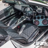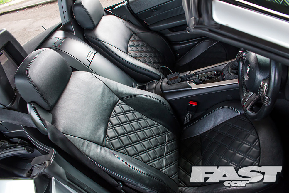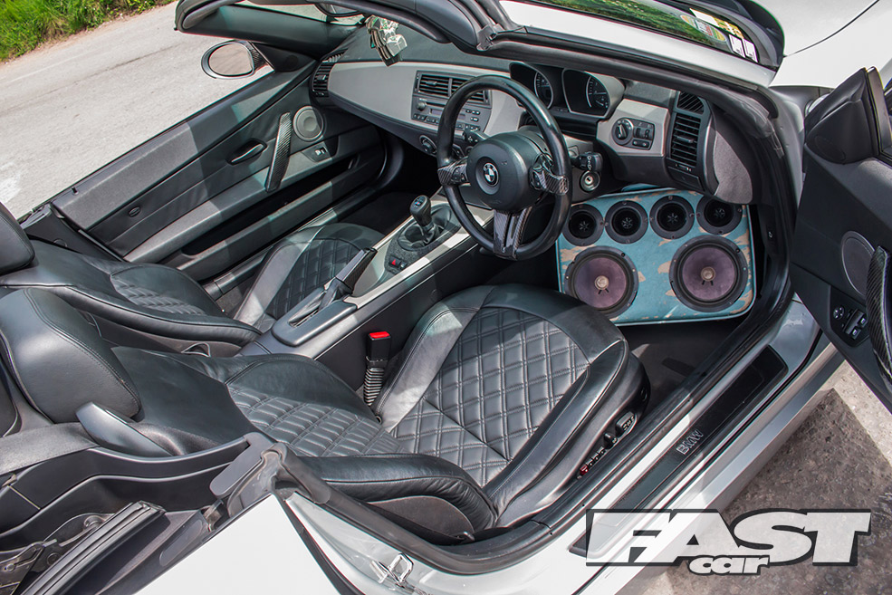 Carbon fibre door handles, handbrake handle and steering wheel controls, 1M shifter, retrimmed M-Sport steering wheel, retrimmed seats and rollbars, custom suitcase boom box.