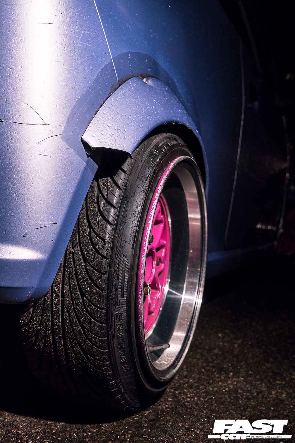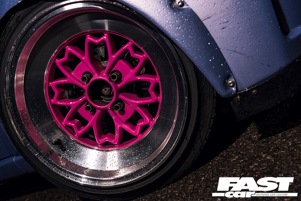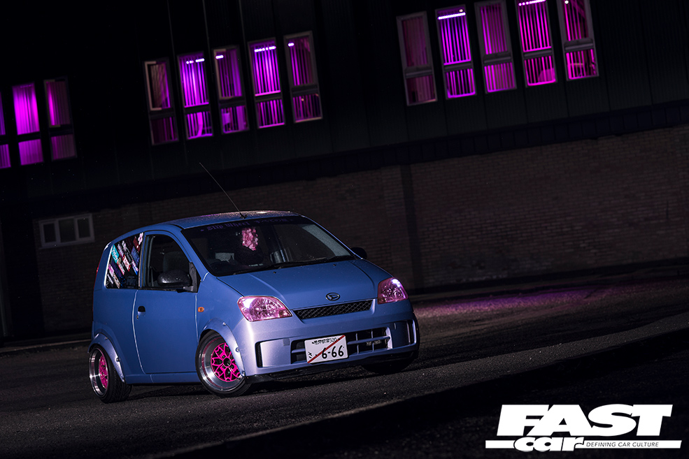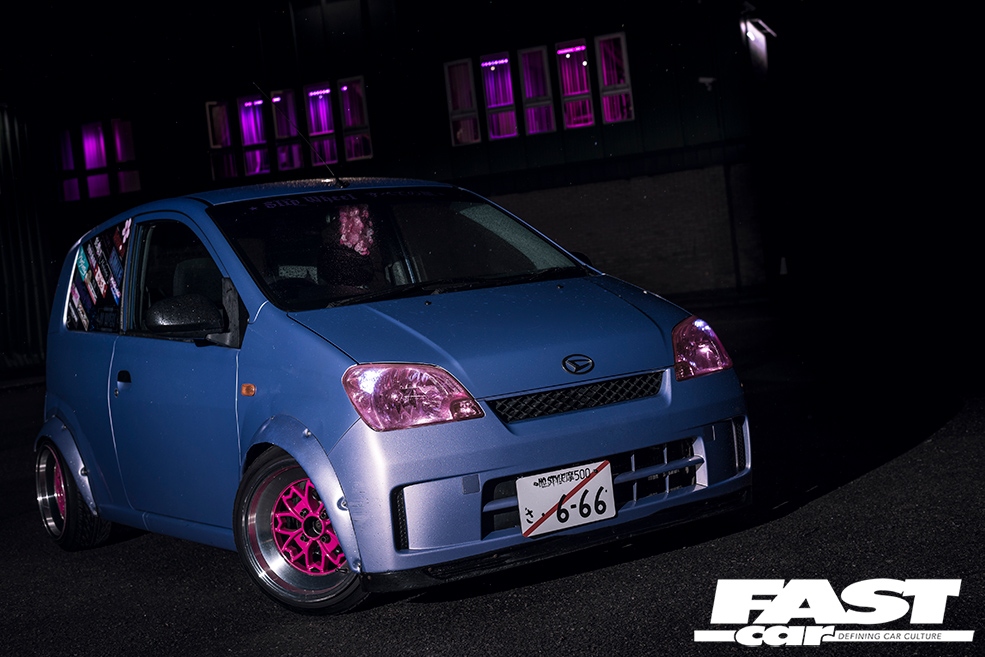 “I love the style of the Rota Alecia wheel, but even the smallest size on offer was far too big for the Mira!” Olivia recalls. Of course, wheels are arguably one of the most important ways to switch up the look of your ride, so were a big priority to allow the dainty Daihatsu to begin standing out from the crowd. With eight inches of width all-round, and with the help of boyfriend Tom, some universal bubble-style wheel arches were soon trimmed to house the pokey wheels, giving the kei-car even more stocky, dainty dimensions. The coilovers were then tweaked to ensure the Mira’s undercarriage was as close as possible to the deck.