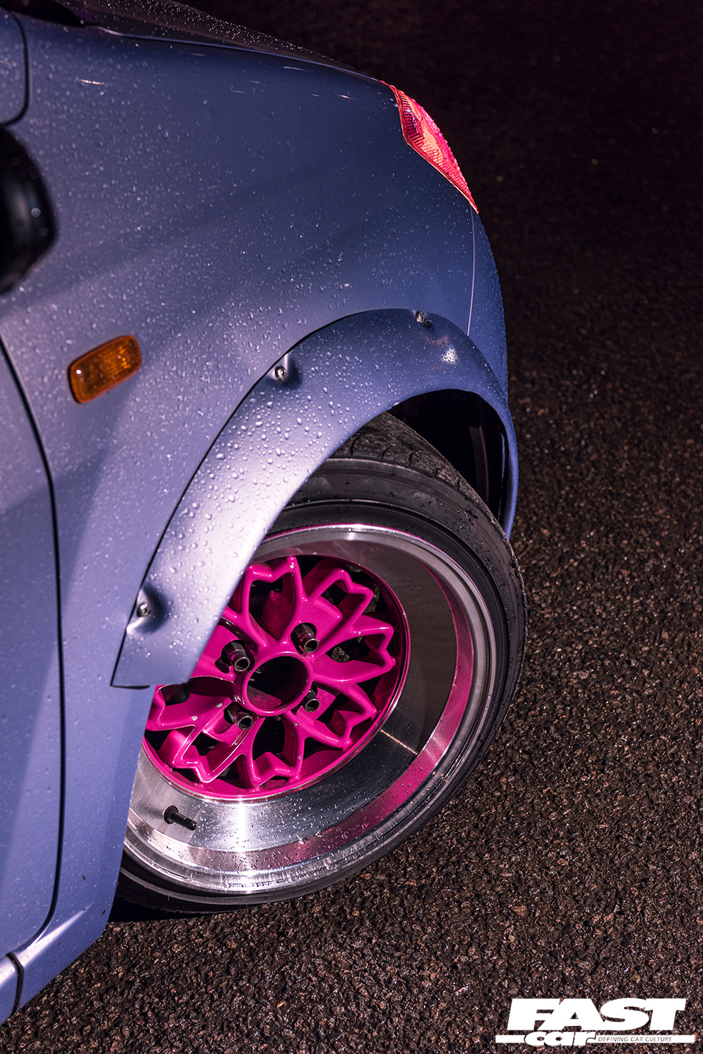 Toyota Corolla front splitter; custom bubble wheel arches; pink headlight tint; JDM show plates; various stickers