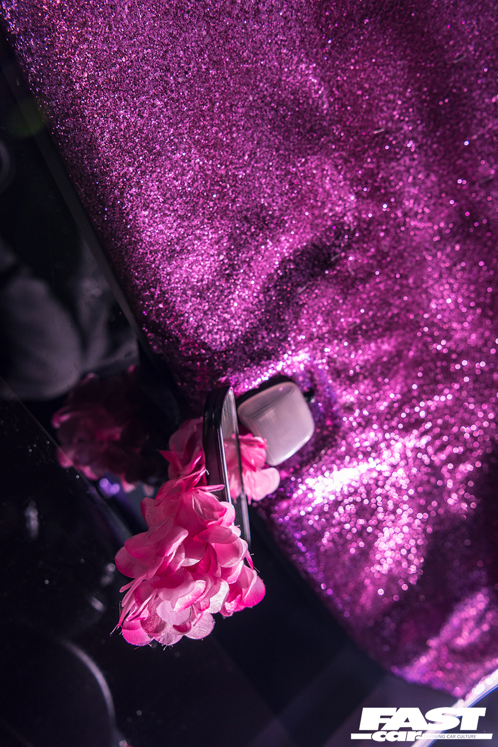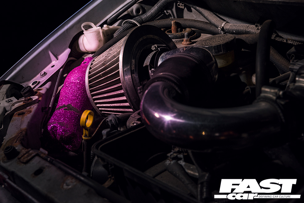 The pink faces of the wheels inspired a bit of a theme for the rest of the car, allowing Olivia a bit of direction when it came to conjuring up some other clever touches to treat her motor to. You probably won’t miss the headlight tints as the car’s coming towards you, for example, and under the bonnet there’s even a glittery oil overflow tank (an old drink’s bottle transformed from home). But it’s the inside where the pink theme is most prominent, firstly with the lavish Slambox steering wheel, and, once you look upwards, the incredible glitter roof lining which was fashioned from scratch by our creative owner here.
