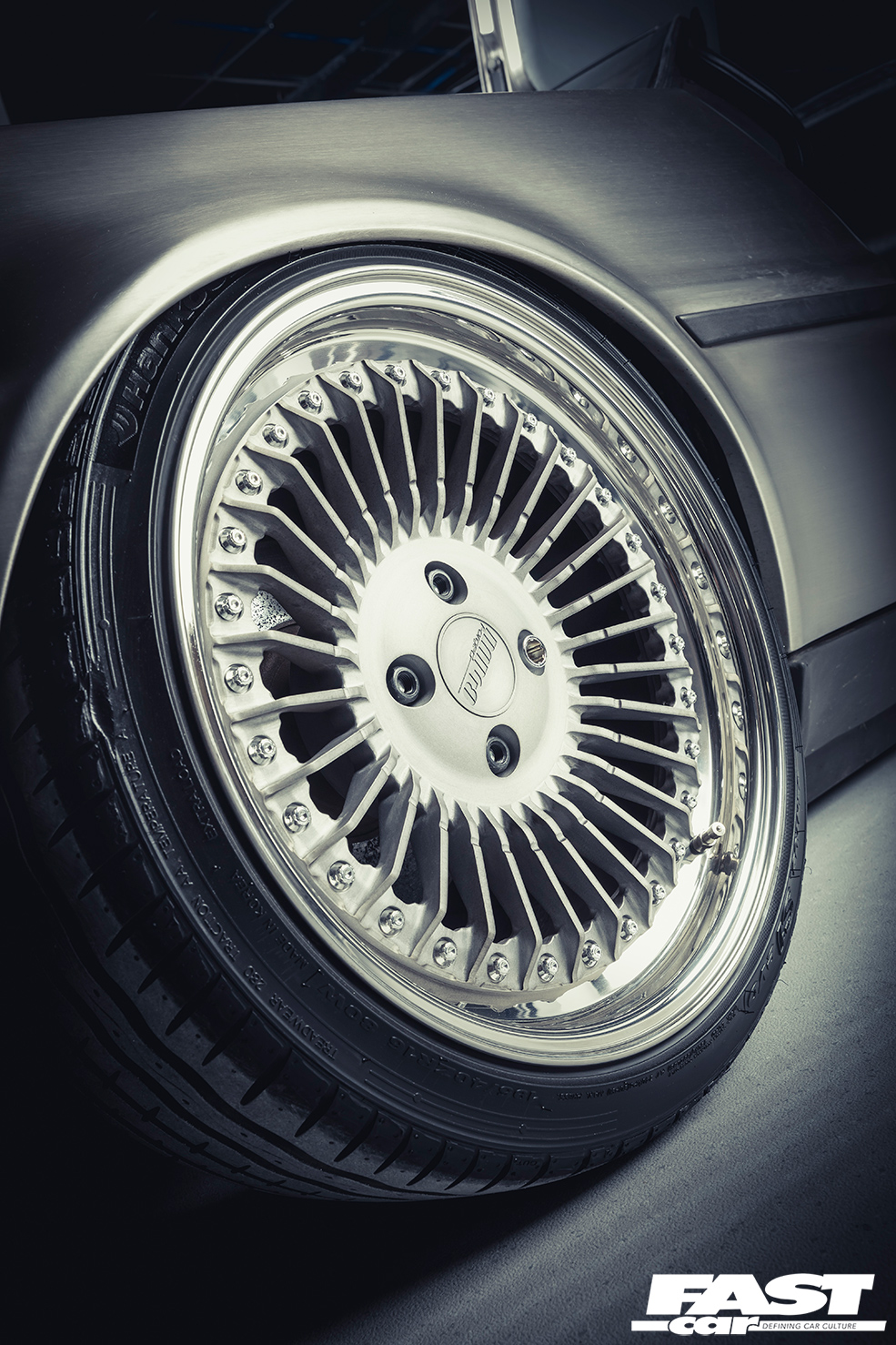 The answer is that they’re fully custom – the only set in the whole world. “I wanted the wheels to look like a modern version of the originals,” reasons Nick. “I set about designing my own in CAD which were essentially a 3-piece split version of the originals; I didn’t want to make splits from the actual wheels for the same reason of making the car returnable to stock if need be. So I then sent the info to a few wheel manufacturers, and the only one willing to take on the job was Mario from RAD48 – he did a total redesign from my design to make them 100% road safe, and after a few months of back-and-forwarding with mods and tweaks we ended up with the final result. The design was then sent off to the factory where they make AMG wheels. I decided on a 16-inch front and 17-inch rear – 2-inches larger than the original, and an offset a whopping 70mm larger than stock on the rear when spaced (goodbye wheel bearings!) – and 35mm unspaced. I chose to space them as it meant that if I had to bring them in for any reason, such as driving abroad, I could just remove the spacers and eliminate any poke from the drive height.”