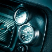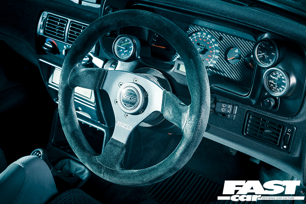 Flocked interior, modified dashboard housing sat-nav, air charge temp and boost gauge, custom dash surround with oil temp/pressure and water temp gauges, Granada Scorpio self-dimming rear-view mirror, Mk4 Fiesta window switches set in modified Escort interior handles, Sparco wheel, Corbeau bucket seat trimmed in new-old-stock Ford Zolder cloth and new-old-stock Ford light grey cloth, Luke four-point driver’s-side harness, custom illuminated BMW E34 gearknob and gaiter, Ford Focus ST2 black sun visors, custom black cloth headlining, carbon Magic Tree
