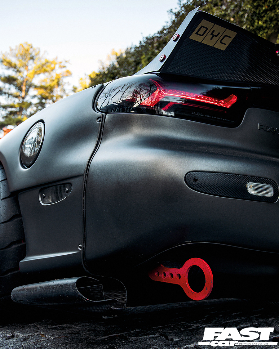 DYC Pro-Line plasti-dip – colour: ‘Motor Oil’; custom front bumper fusing RE-Amemiya N1-05 and FEED Type 2R parts with custom carbon accents; FEED signal lights; TCP Magic G-FACE GT wings; side skirts and carbon front wing diffuser; APR Performance wing-top vents; custom carbon ducktail spoiler; Scoot bonnet; FEED rear wing flares; custom Built 2 Apex front splitter and mounting brace; RE-Amemiya carbon rear splitter.
