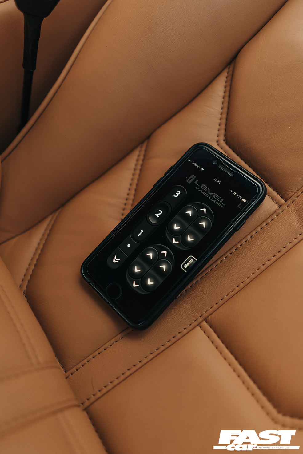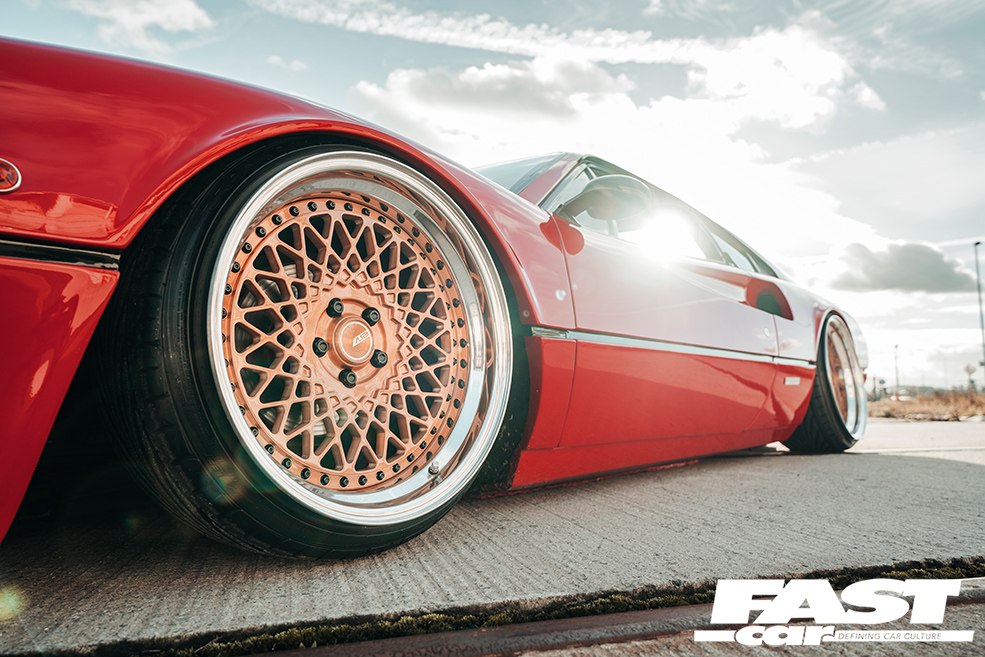 Using a new-old-stock set of OE-spec Konis as a base, he meticulously crafted a custom air-ride system for the Ferrari, carefully massaging the arches to fit some scene-busting rims under there to complete the effect. The design had to be something fresh and contemporary, yet with a retro motorsport vibe, and he’s vividly ticked this box in choosing a set of 18-inch AL13 Heritage Series S20 wheels, with brushed gold centres and polished lips. The rears are a supercar-tastic 10.5-inch wide, which looks mean as hell from dead-on rear. And it’s impressive to note the fronts are 10-inch wide – that must be fun with the unassisted steering. All part of the drama though, isn’t it?