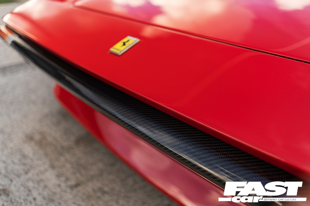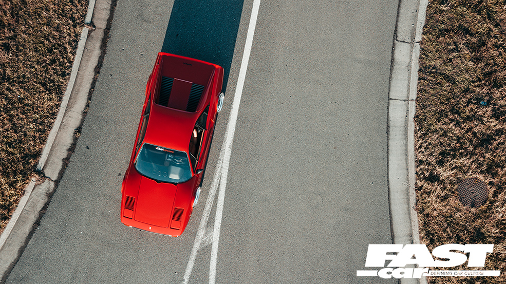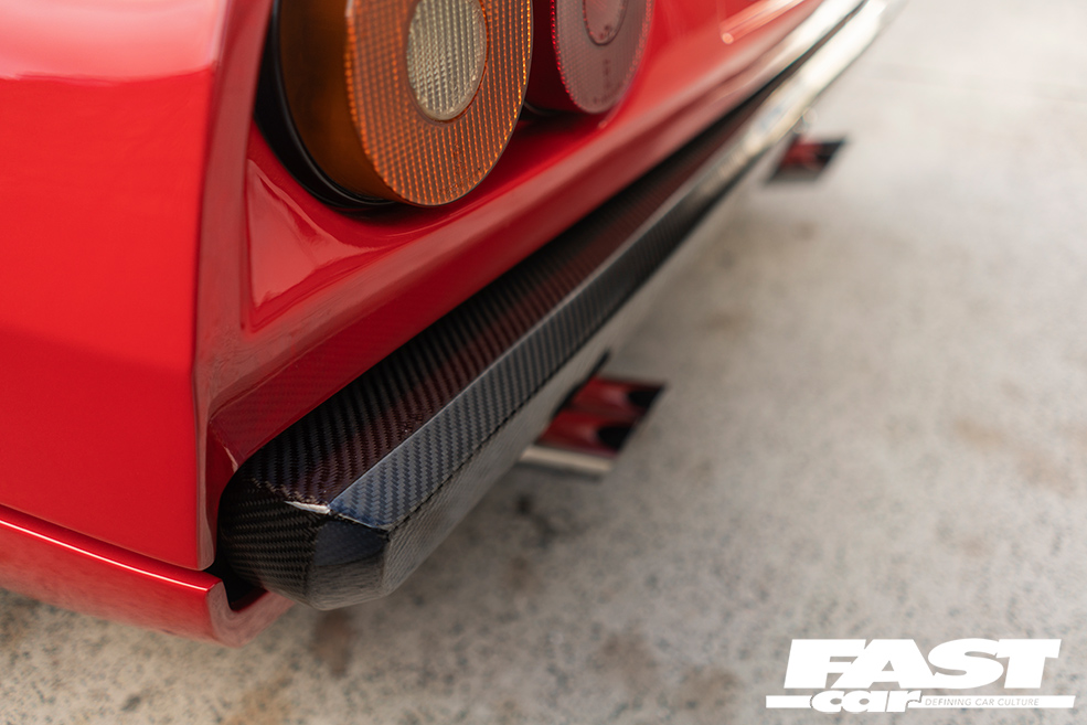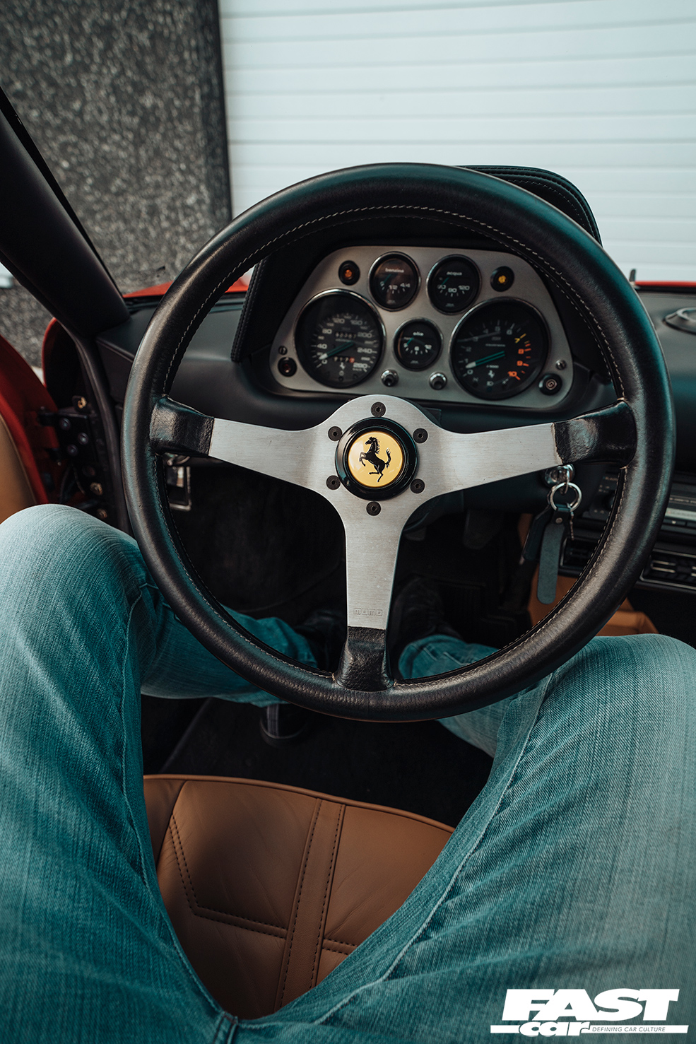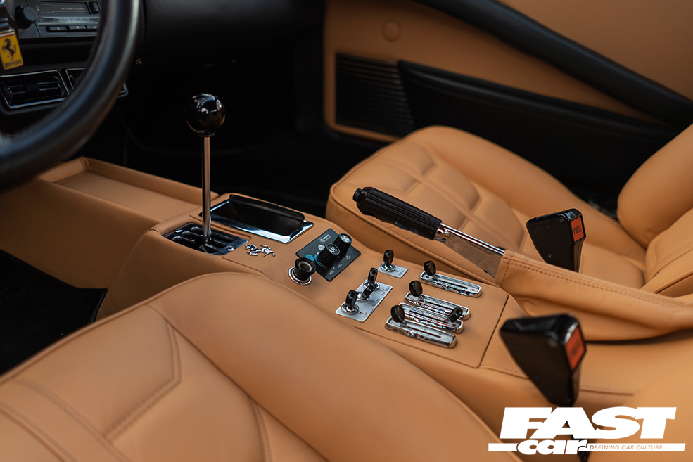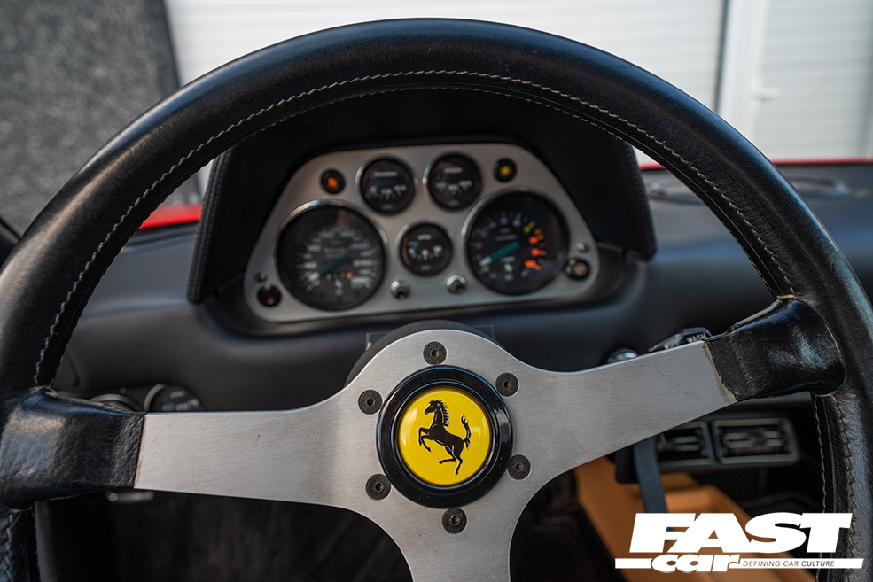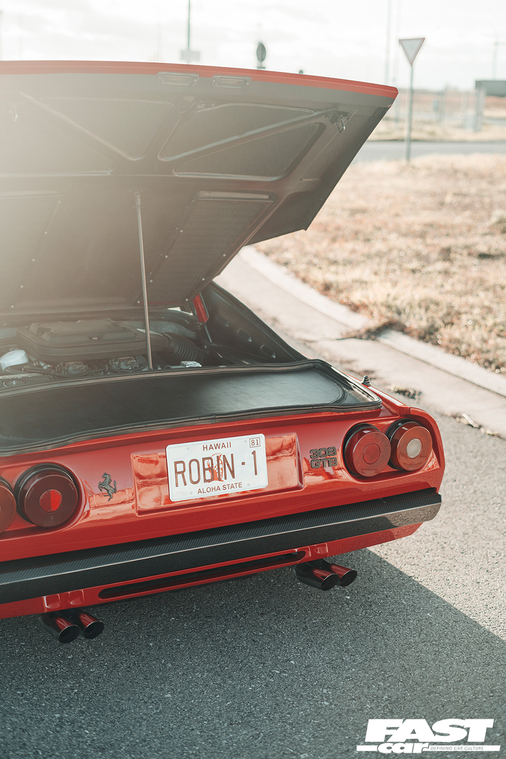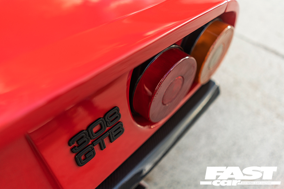 All right, it wasn’t quite as easy as all that. The body had to be comprehensively straightened and perfected before being reshot in lustrous Rosso Corsa paint. While he was at it, Andy threw in a few custom touches to ensure this would be a Ferrari like no other; the 308 came with a subtle roof spoiler which he’s carefully deleted and smoothed away any evidence of, along with the wipers, front fog-lights and passenger mirror, replacing the driver’s side one with a carbon fibre item.