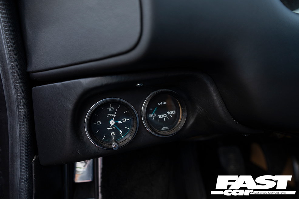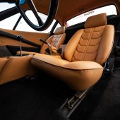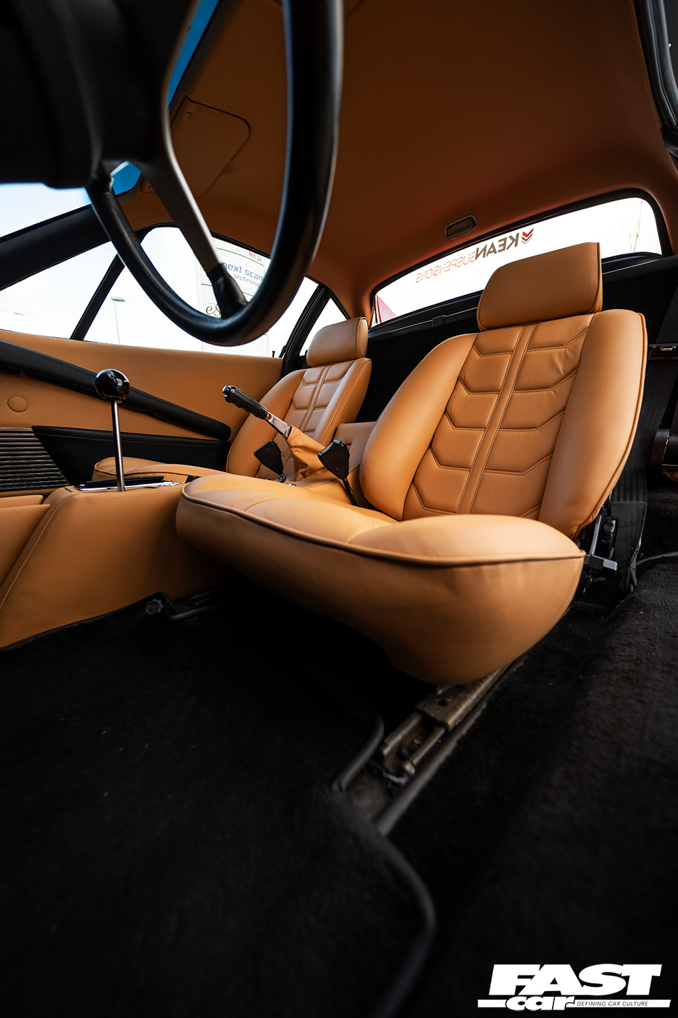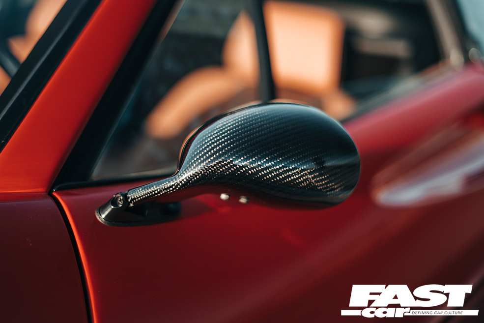 Looking closely, you’ll spot that the front and rear bumpers are also carbon fibre, carefully crafted to ape the exact dimensions of the originals. And naturally this undertaking was as much restoration as it was custom job, so every single nut, bolt, washer and seal has been renewed to make the car better-than-new. This is also true of the interior, where rather than radically overhaul things, Andy’s simply had the original seats retrimmed in sumptuous new leather, along with the doorcards, dash and centre console, with a new headlining above. It makes for a fabulous place to sit.