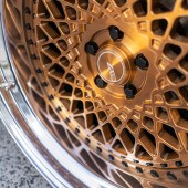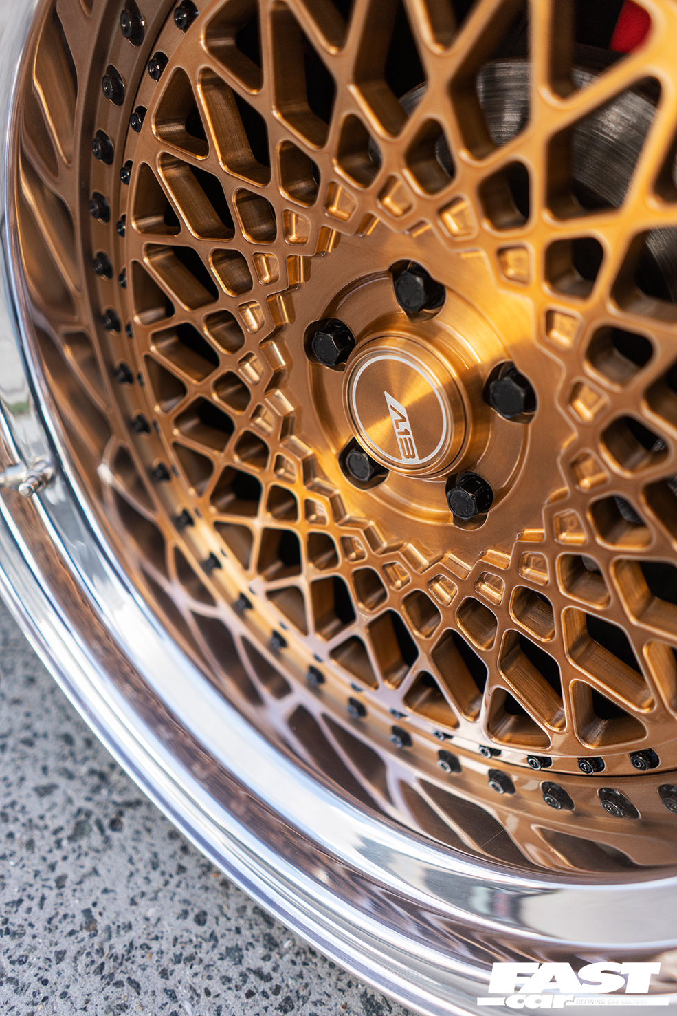 10x18in (front) and 10.5x18in (rear) AL13 Heritage Series S20 wheels with polished lips, brushed gold centres and black hardware; Toyo T1-R 215/35×18(f) and 235/30×18(r) tyres; custom KEAN Suspensions air-ride setup based on NOS OEM Koni shocks; Accuair E-level rocker switch and I-level; Accuair Endo tank and hardline install.