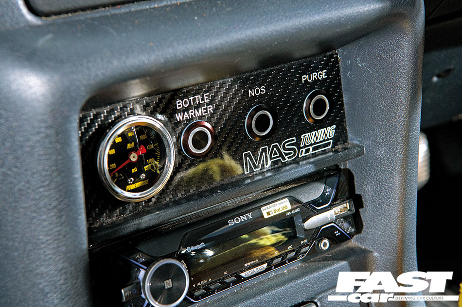 With that noticeable increase in power all sent to the rear wheels, the T5 gearbox now benefits from hardened internals and an Alcon 6-paddle clutch, while a combination of Compbrake 6-pot calipers with 330mm rotors up front and 4×4 calipers with 300mm vented discs on the rear greatly improve stopping power. “When the car was first built for motorsport, it received a welded-in multi-point rollcage, triangulated from the struts to the rear diff,” Mark says. “I never planned on taking this out, though it was tricky to repaint it by hand!” Retaining the cage also meant that installing the flocked dash took more time and effort than he’d hoped too! Aside from that troublesome cage and a dash that’s a nightmare to keep clean, the remainder of the cabin is a lightweight motorsport-themed affair as you’d expect, with carbon doorcards, Sparco seats, Stack gauges and a GPS speedo all present.