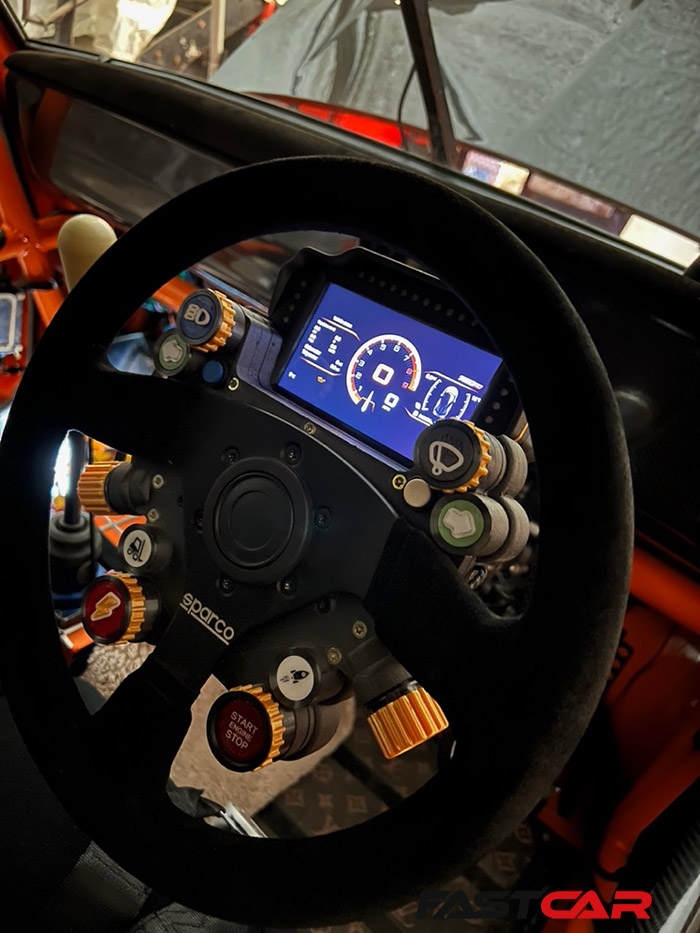 The steering wheel release is 3D-printed, and the wheel itself is a Sparco and I’ve made it a little bit fun – so now it has launch control, anti-lag, a forklift truck button for lifting the air cups at the front… you can turn on and off the headlights, you can flash, you can indicate, and then you’ve got the paddle-shift. The whole idea was to put all of the controls for the car into one place rather than having buttons down on the dashboard – the electronics are integrated into the CANbus with a quick-release.