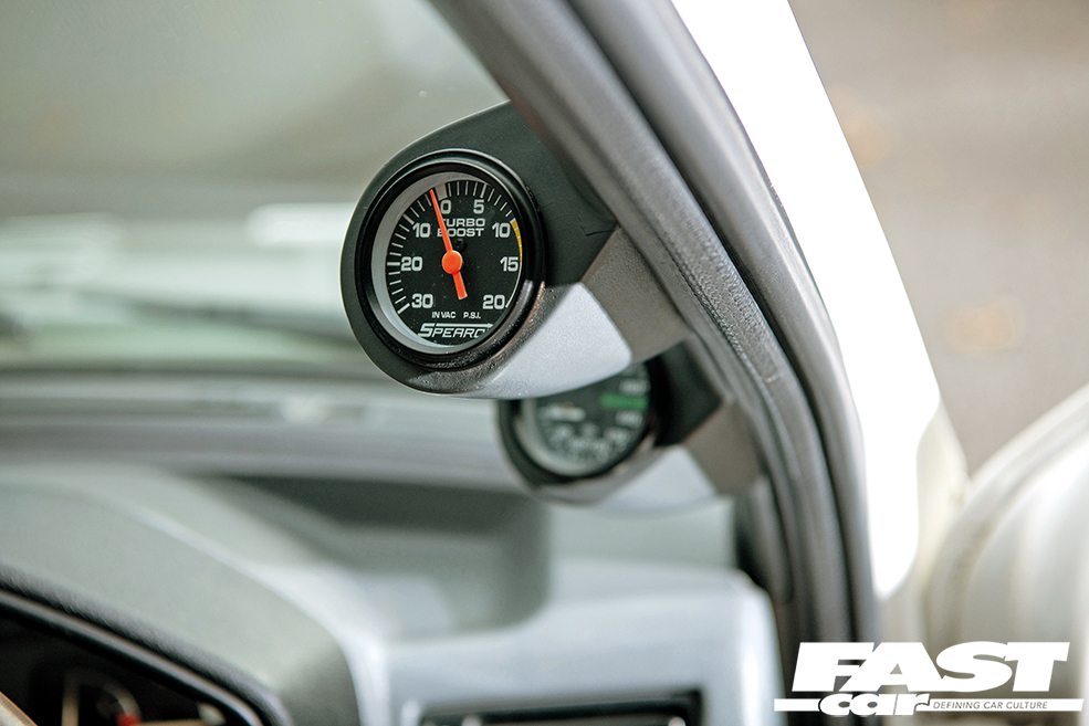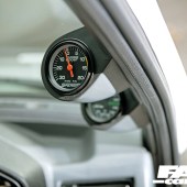 Mint original interior, four-spoke steering wheel, custom gauge pillar pod, Racetech oil temp/pressure gauge, boost gauge, updated speakers