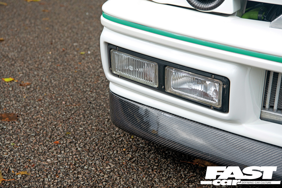 Morette twin headlights with alloy inner air intakes, one-off lights from a CCM Spitfire motorbike, LED angel eye sidelights and LED main headlights, amber front and side indicators, RS Accessory rear lights, Mk3.5 mirrors, Autoflock VR6 splitter made in one-off carbon Kevlar