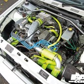 1596cc CVH turbo, lowered compression, forged pistons, weight-balanced conrods and pistons, steel head gasket, ported head, 1mm oversize valves, Piper Cams Ultimate Road BP285T2 cam and lifter kit, Escort RS Turbo exhaust manifold, Stage 3 Cosworth T3 turbo with 0.48 housing, Pro Alloy front mounted intercooler, Airtec Motorsport alloy radiator, Omex 600 ECU and race-spec loom, Bosch 350cc injectors, Cosworth 3-bar map sensor, injectors, Mac boost solenoid, Motorsport Developments braided fuel pump loom, braided fan loom and fan temperature switch, 255 Walbro fuel pump, Mongoose 4in outward rolled exhaust, Roose Motorsport silicone hoses, alloy header tank, Bailey Motorsport breather tank, Spal 12in fan, GGR K&N Cosworth air filter and waterproof sock, Vibra-Technics engine mount