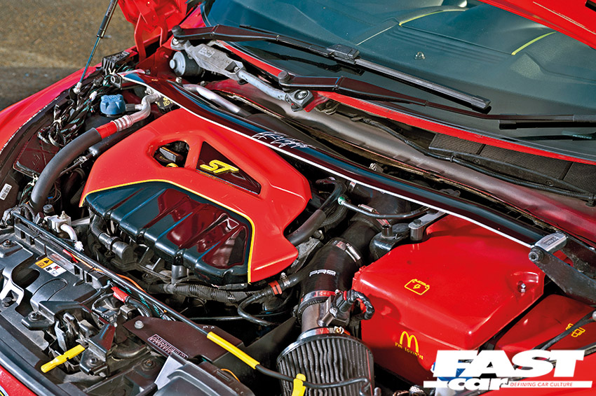 1596cc EcoBoost, Turbo Technics S242 turbo, Turbosmart recirc valve, Airtec Stage 3 intake, Airtec Stage 3 intercooler, Airtec de-cat, Powerflex upper and lower engine mounts, Mongoose 3in non-resonated cat-back exhaust system, Paintmodz engine cover, battery cover and fuse box cover, Airtec header tank