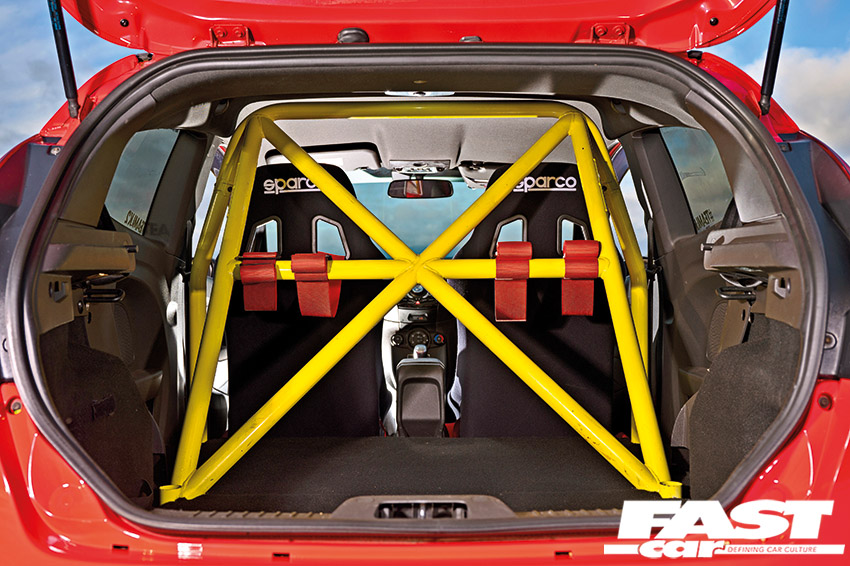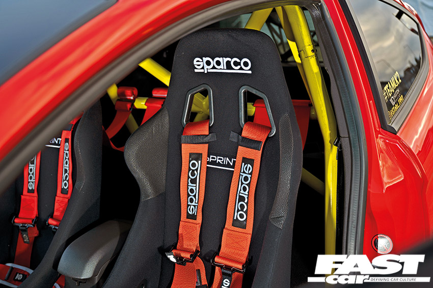 Sparco Sprint bucket seats, Sparco harnesses, Mountune gearknob, Airtec Clubsport roll cage, Turbosmart boost gauge, Lufi X1 revolution OBD gauge, Mountune floor mats, custom-made false rear floor