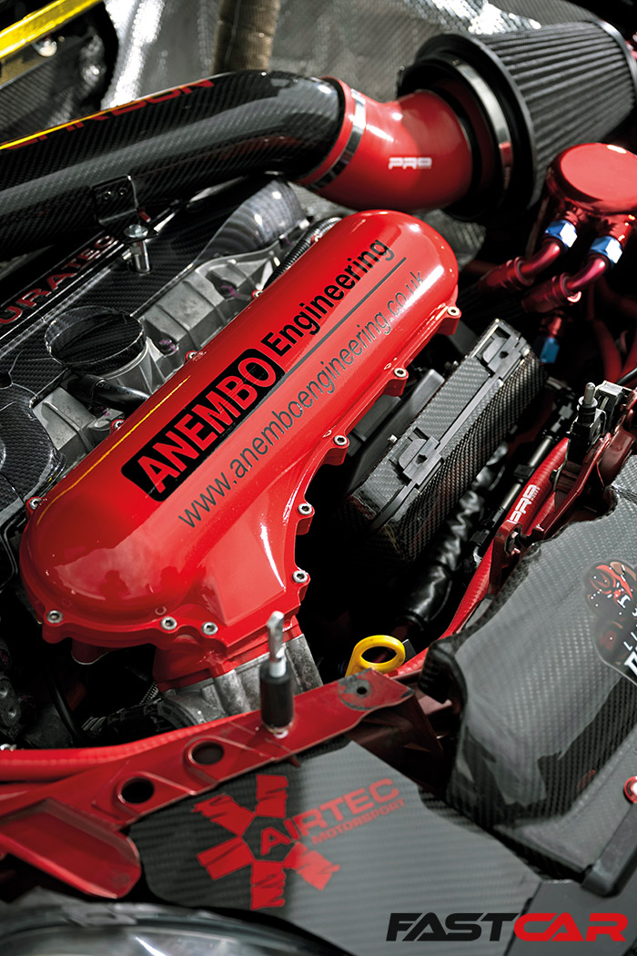 A Nuke Performance fuel system with surge tank and modified fuel rail feed 1000cc injectors. A dual ceramic ball bearing Garrett GTX3582R Gen 2 turbo is paired with a Tubosmart 50mm wastegate. An Anembo enlarged throttle body and plenum are a tried-and-tested duo, while the Matt Lewis Motorsport and Spec-R collaboration breather system and Mishimoto oil cooler ensure lubrication temperatures stay safe.
