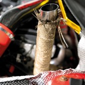 Mason reports that the most challenging part of the build was getting the screamer pipe to fit. Dean at RW Developments came up trumps with his superb fabrication work, and modified the Nortech tubular manifold to allow the screamer pipe to exit via the bonnet. No mean feat, as it manages to start at the back of the engine, avoid water pipes and the strut brace, and exit adjacent to the centre of the head. Seeing flames shoot into the night sky when the car is pushing on reportedly never gets old.