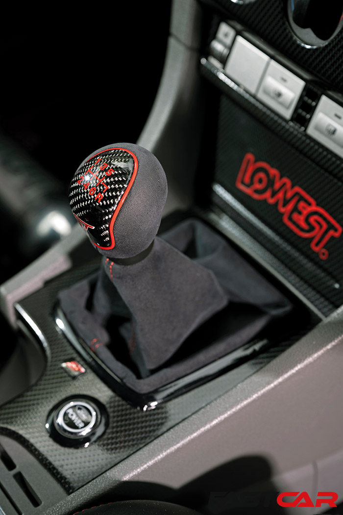Full RS interior reupholstered in black leather and Alcantara with red stitching and red ST embroidery, carbon fibre sunglasses holder, carbon fibre custom steering wheel, carbon fibre custom gearknob by SS Tuning, carbon fibre handbrake handle, carbon fibre air vents, carbon fibre seat backs, carbon fibre centred clocks, custom speedo and rev gauge, Alcantara top boost pod cover, custom leather and Alcantara parcel shelf, Alcantara door card inserts, leather and Alcantara armrest, Toucan display in air vent, fuel system and battery relocated to boot