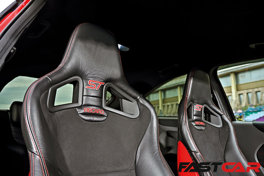 Many well-thought-out feature cars follow a theme throughout the build, and Mason’s is no exception. Although an RS Focus liberated its Recaro interior, Mason wanted to sing his ST song loud and proud, and thus had the Recaros reupholstered in leather and Alcantara with red ST embroidery. Red stitching further ties in the exterior.