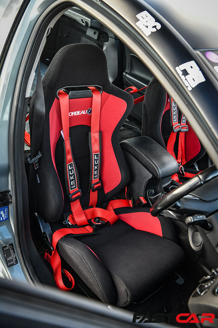 Aiding the handling, we removed a substantial amount of weight from the interior. The stock half-leather, heated seats were very comfy but not very supportive. And incredibly weighty. Replacing them with a pair of lightweight reclining bucket seats from Corbeau allowed for comfort for road use and supportive for track work. It also allowed us to fit some proper Luke four-point harnesses for the track while retaining the OE belts for road use.