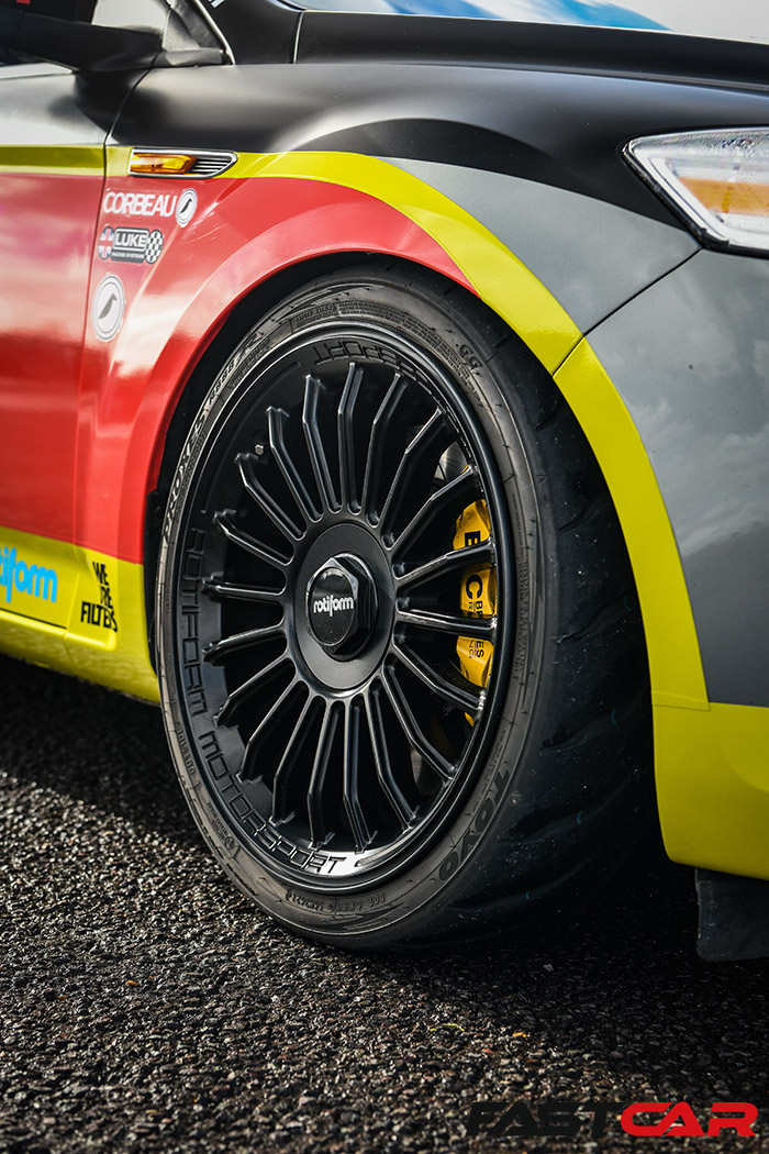 The modified Ford Mondeo Mk4 paid EBC a visit at their Northampton-based HQ. The R&D team set about designing a kit that would see EBC’s famed Apollo four-pot calliper and 355x32mm fully floating discs fitted to the front. A set of matching grooved rear discs were also added, and Bluestuff pads fitted all round.