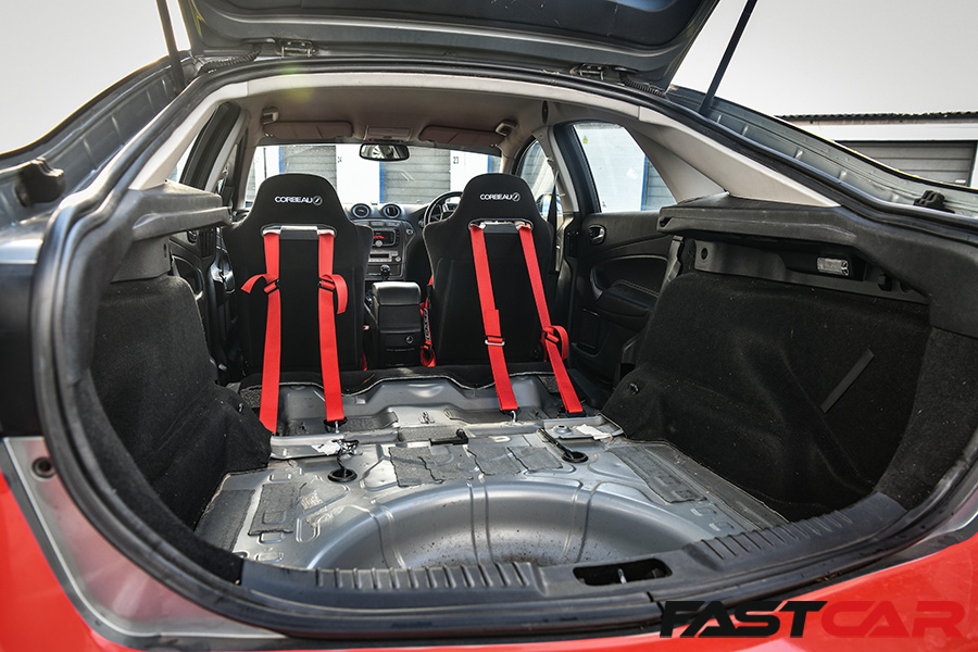 Corbeau RS2 reclining bucket seats mounted on Corbeau/Mk4 Mondeo subframes; Luke four-point harnesses; rear seats and carpets removed.