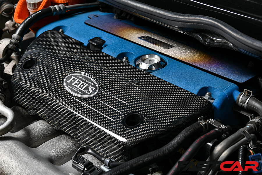 JDM K20a; GruppeM RamAir System; Toda Racing Full exhaust; FEEL’s ECU Type B (NTS); FEEL’s ECU Case; FEEL’s Inlet Manifold Cover (Twill Weave); FEEL’s Oil Cap; FEEL’s Large capacity Radiator; FEEL’s racing box; FEEL’s Radiator Cap; Chasing J’s Titanium Plug cover; Seeker reservoir covers
