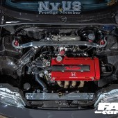 B16A1 1.6-litre 16v VTEC, Hasport engine mounts, B16A2 throttle body, Killerglass velocity stack, Outerwears velocity stack bootie, Mishimoto straight couplers, SRS 4-2-1 exhaust manifold, SRS adjustable test pipe, Tanabe Touring Medallion cat-back system, Mishimoto radiator and slim fan, Mishimoto hoses, Mishimoto coolant tank, fully tucked and shaved engine bay – skinned with carbon fibre, home-made carbon engine mount covers, painted engine and gearbox, chromed nuts, bolts and hose clamps, catch tank removed, washer fluid reservoir removed, wiper motor removed, fusebox relocated, battery relocated, MAP sensor relocated, brake force distributor relocated, Downstar brake line and fuel line tuck, Aeromotive 10-micron fuel filter with AN couplings, Skunk2 oil cap, Skunk2 brake fluid reservoir cover