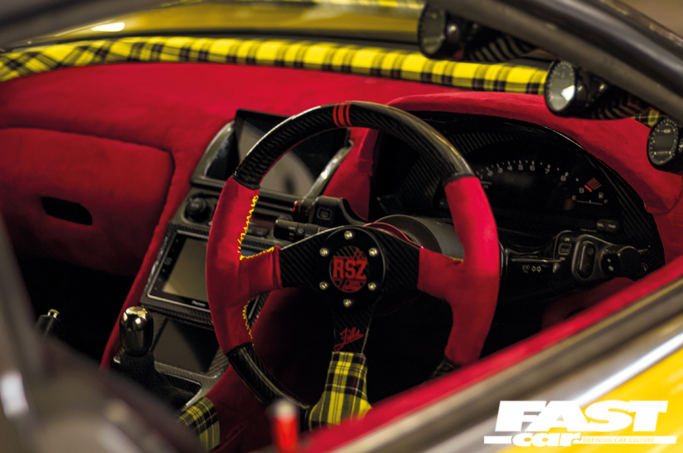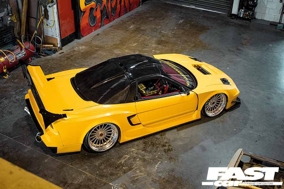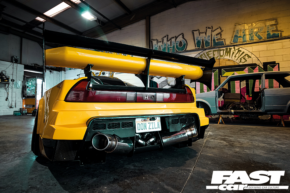 “All the work was carried out by myself and a few good mates,” he assures us. “I’ve always wanted to paint my own car, as I helped out with the Civic’s last three paint jobs, working weekends in a bodyshop to learn the skills. And I thought now was the time to do it; I’d decided on the way home from collecting the NSX that it was going yellow – Lexus Naples Yellow Pearl, to be exact – so maybe it wasn’t the best decision to learn to paint on a super-rare car… but everything can be fixed if I fuck it up! And being a bit mental I thought ‘well, let’s just do a three-stage pearl paint job for my first time’.”