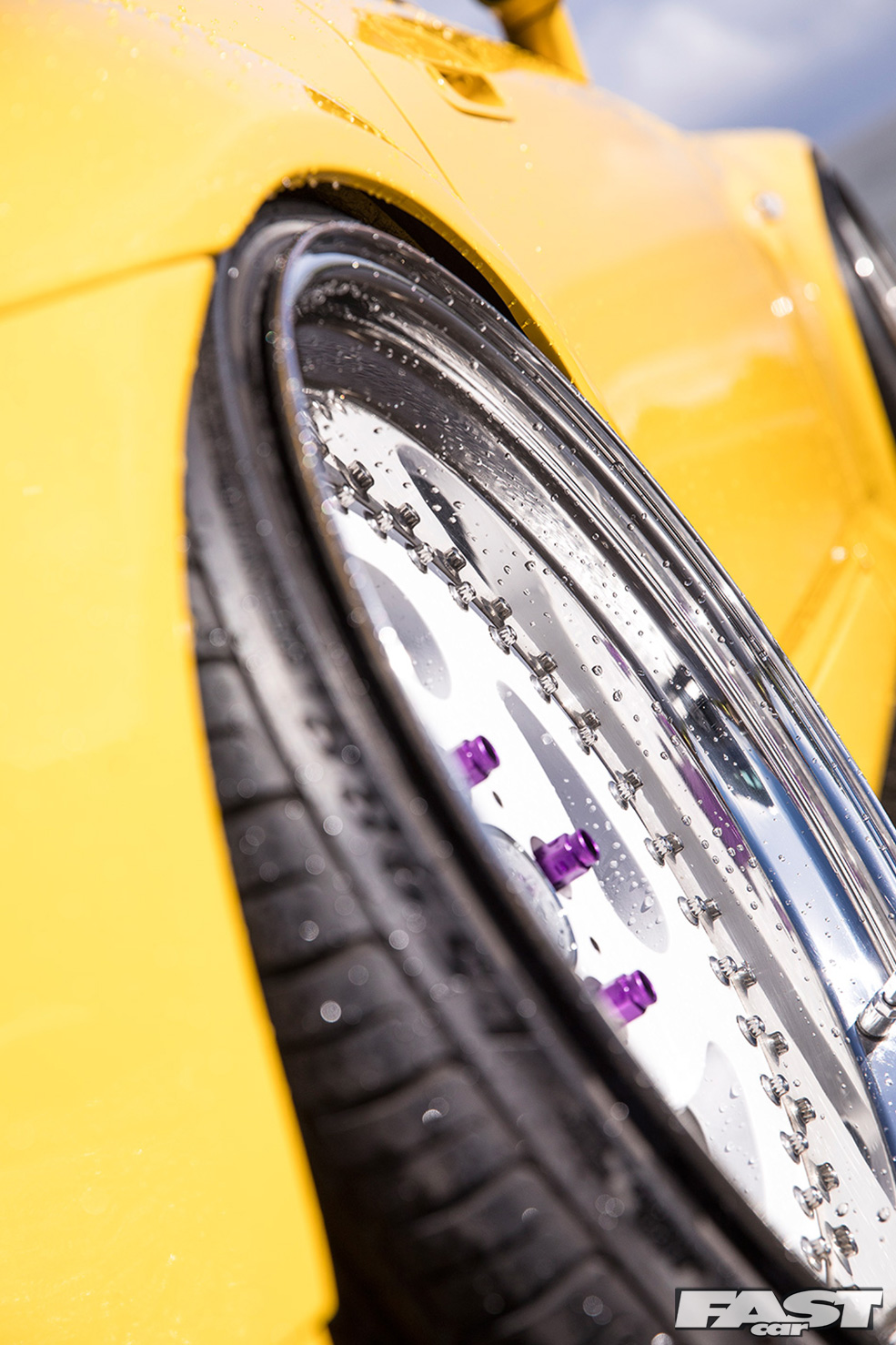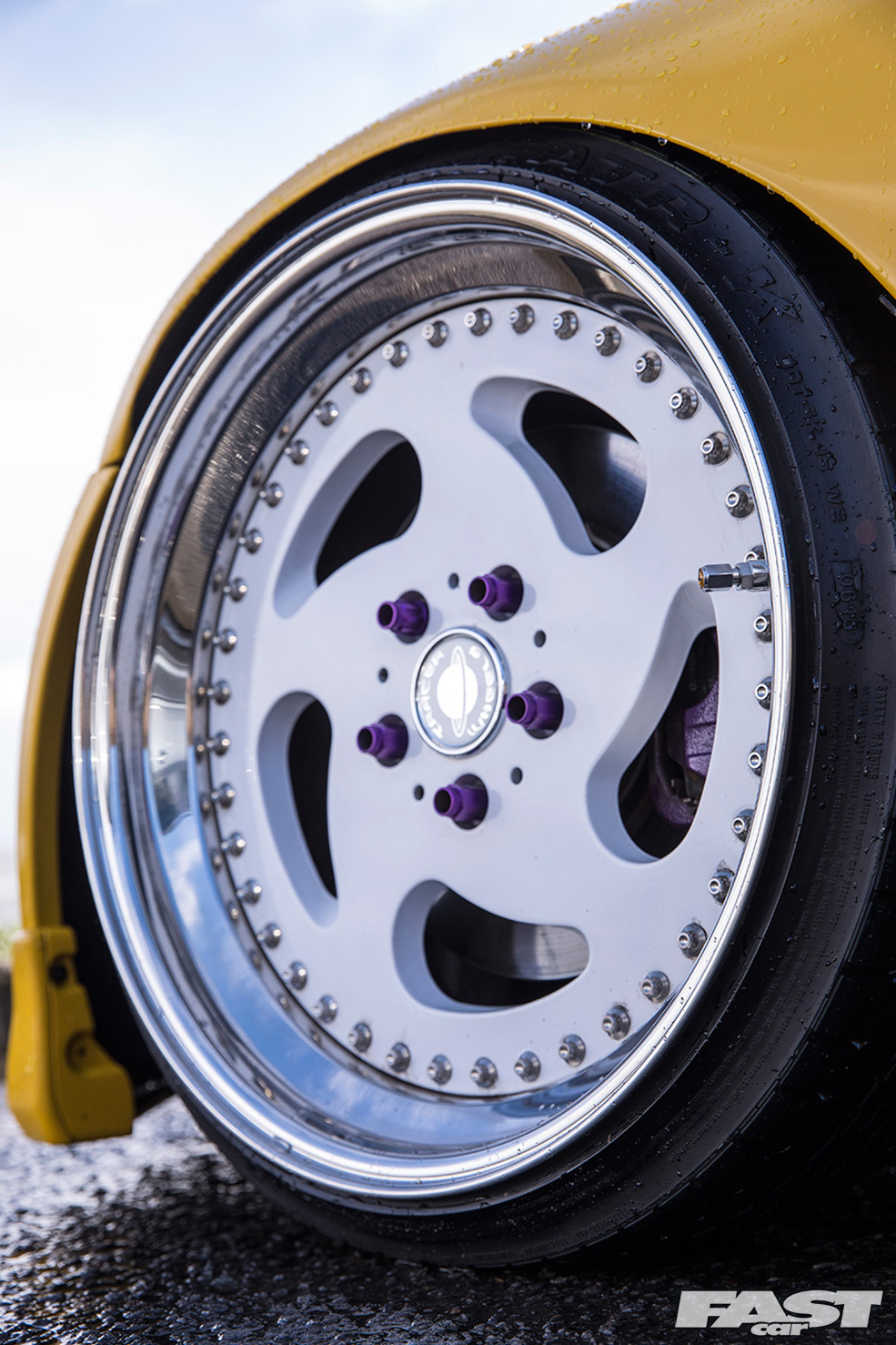 The car currently sits on a set of Schmidt Tracer Tech 2s (fronts – 18×8.5, et14 and rears: 18×10, et7), all housed by Landsil tyres (195/35×18 fronts and 215/35×18 rears). Lydia says the reason for this choice of tyre is because they stretch easily. Not too much, though, officer. We promise.