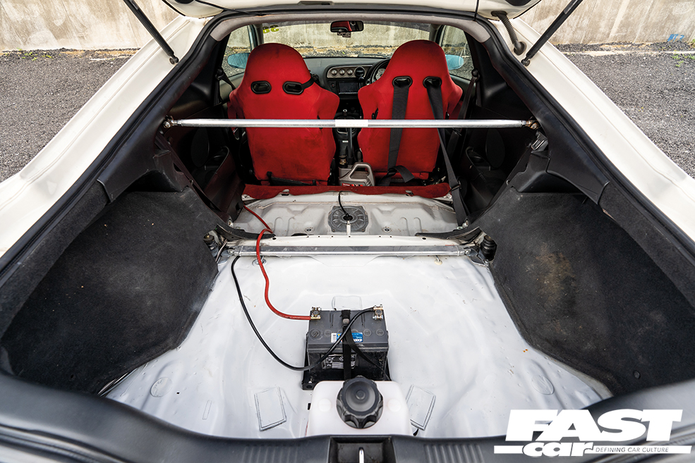 Peek your head behind the seats and you’ll find a whole lot of nothing. The rear seats and all trim has been removed in a bid to save weight and in its place you find a relocated battery and the Coolingmist water meth system.