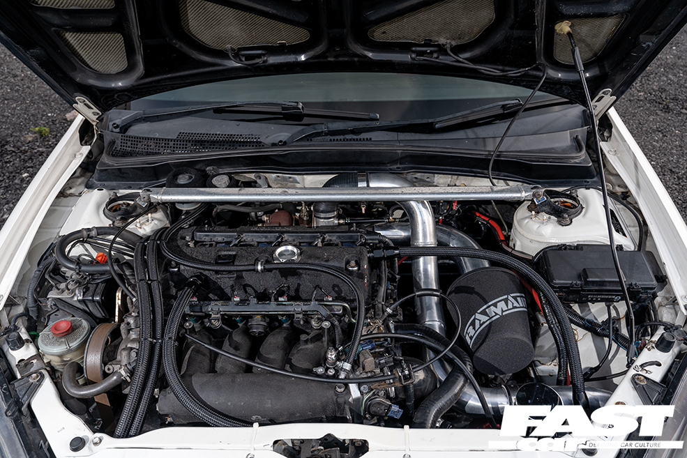 2.0-litre K20A i-VTEC engine, cast log manifold, RBC inlet, Ramair cone filter, Leadfoot Racing intercooler, Leadfoot Racing custom 3-inch exhaust with downswept tailpipe, Garrett T3/4 hybrid turbo, oil cooler and catch can, Deatchwerks 850cc injectors, Walbro 255 pump, Hondata k100 mapped by J.Cal, polybush engine/gearbox mounts, Koyo radiator, J’s racing sump/gearbox drains