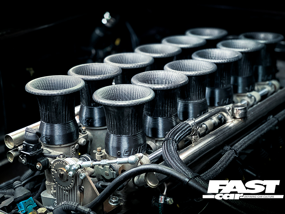 6.5-litre V12, custom intake for individual throttle bodies, carbon fibre velocity stacks, R-GT GT1 exhaust manifolds, twin Bosch 044 fuel pumps, twin Emerald ECUs 686bhp, 600lb.ft