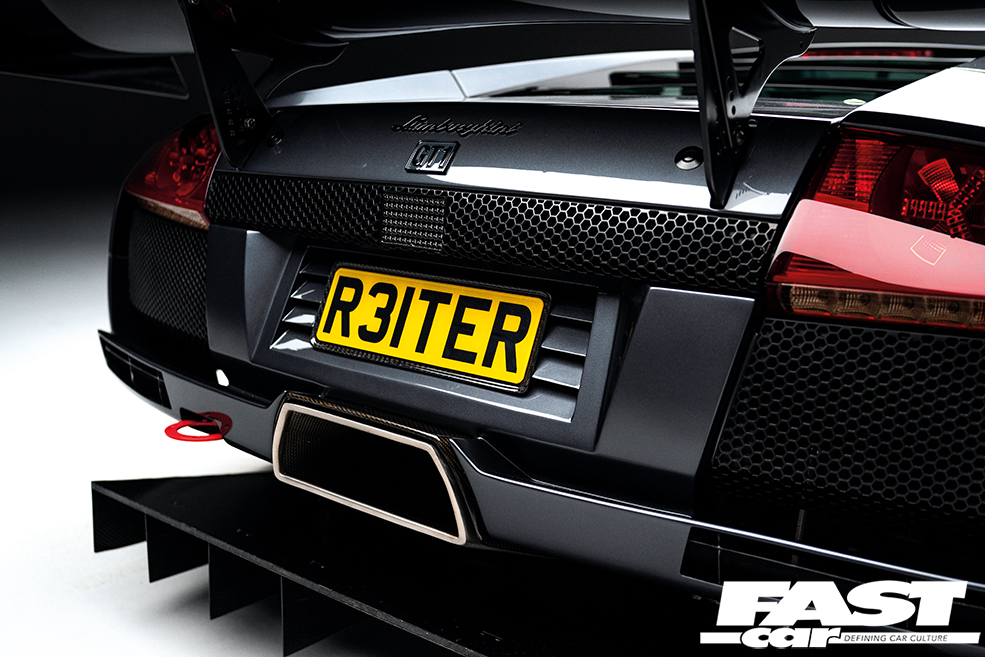 “The Murciélago was at TJR BodyworX for fourteen months to create the final look,” says Phil. “Making race panels fit a road car and look right is a huge task! There was so much fabrication that needed doing just on the bits you don’t see; then completely redesigning the door to front wing, the wings themselves, blending the R-GT and LP640 sideskirts, making wider rear quarters to our own design, and so much more.” Challenges came from all manner of unexpected quarters; the wing mirrors, for example, had to be converted from left-hand-drive R-GT items, and needed to be massively modded in order to offer any sort of actual rear view. The rear decklid is a custom carbon fibre item, crafted by Fibre Factory, eliminating the standard spoiler as of course the car’s now wearing a Le Mans-spec wing. From the high-maintenance Perspex headlight covers to the 3D-printed GT1 badge and rain light, it’s a riot of detail that represents an astonishing amount of work.