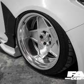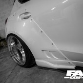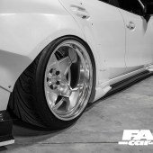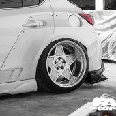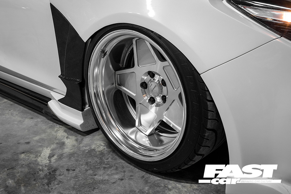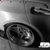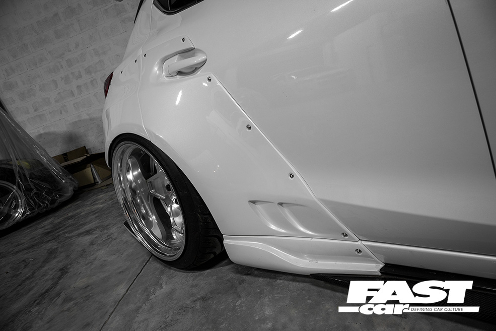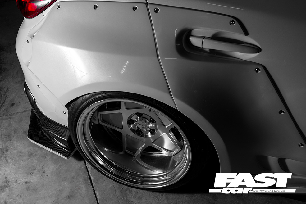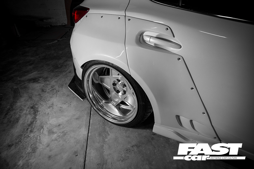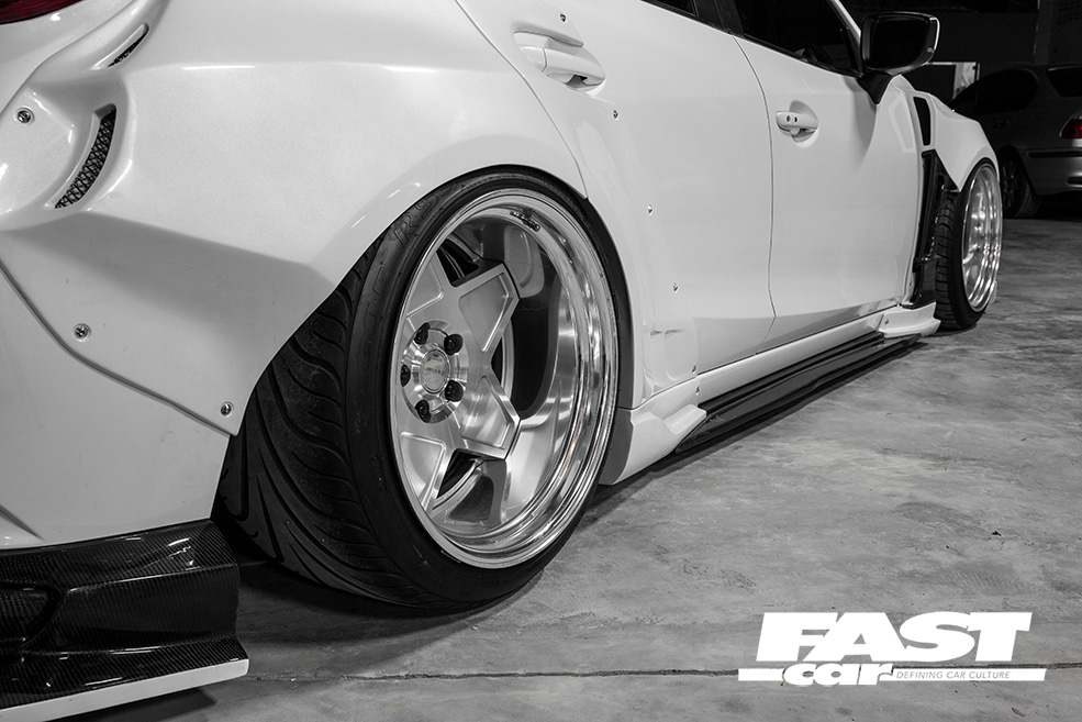 Supachet was overjoyed. But a nagging thought kept crossing his mind: his freshly slammed machine needed slamming rims. Hop-Up were only too happy to help. “As soon as we finished the air suspension,” they explain, “Supachet started looking for new wheels. We had a set of WORK Seeker SX alloys in our workshop and they caught his eye – he was really keen to put them on his car.” His heart was set on the deep dished five-spokes, but Hop-Up had a reality check in store: they just wouldn’t fi t without a set of wider arches. Luckily, Lhee had a solution. “Polly at Garage Unique is a friend of mine, so I suggested Supachet send his car there for a widebody kit.”