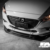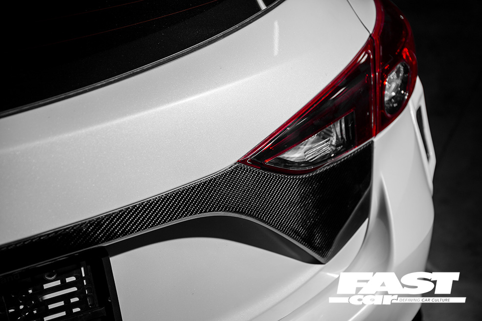 Mazda 3 body with standard bumper and full custom Garage Unique bodykit, featuring: lacquered carbonfibre front splitter with support struts; riveted front wide arches with vented rears in lacquered carbon fibre, full length side skirts with lacquered carbon fibre inserts; riveted rear wide arches with integrate rear vents, lacquered carbon-fibre boot panel insert, rear diffuser with lacquered carbon-fibre end caps and painted highlights, high-rise rear wing and twin lacquered carbon-fi bre faux wing vents; WORK numberplate surrounds.