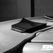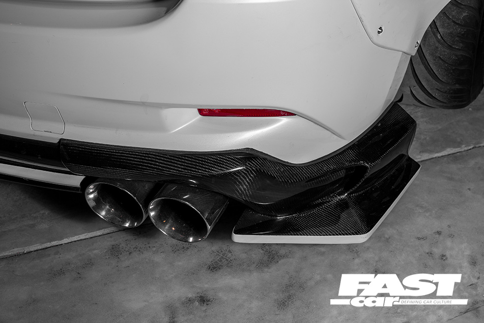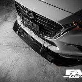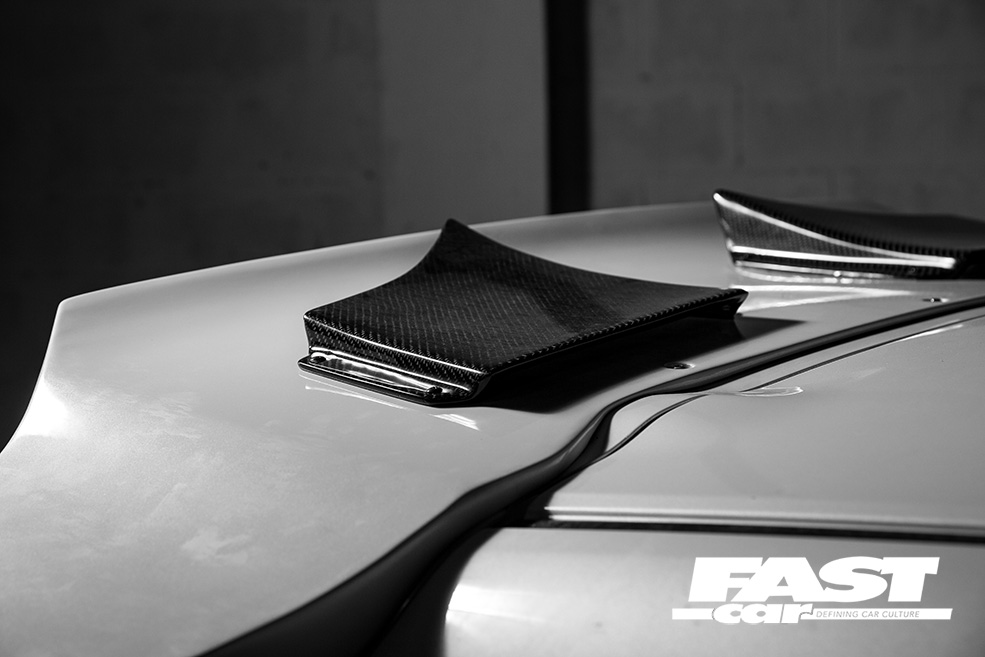 The Mazda build is no different. The front shouts with a jutting carbon splitter, while the rear counters with a shining carbon strafe and an ornate diffuser that drops down hard to the left and right. The rolling side skirts, complete with carbon flashes, draw you to the floor. The long-lipped rear spoiler jets away from the roofline to shock the sky. Yet you always come back to those wheel arches, each one studded with vents, exposed bolts and bold, clashing curves. The fronts take it even further, standing on struts of carbon fi bre which slash against the partially exposed tyre below.