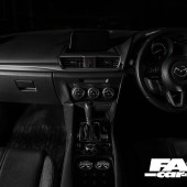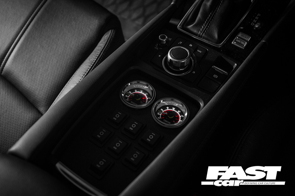 To get the Mazda3 arch tucking, Hop-Up dovetailed one of their own eight valve air suspension systems with boot-mounted VIAIR compressors, a pair of in-car pressure gauges and a collection of in-car control switches. The result is neat, with the compressors and tank sitting in three shaped and shallow recesses in the boot floor. Lit by rings of bright-white LEDs, they sear through the hatchback window to highlight the car’s floor-touching talents.