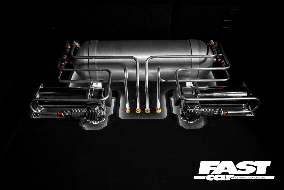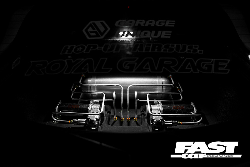 Hop-Up Airsus eight-valve air suspension system with VIAIR boot-mounted compressors and Air Lift 3P digital management; WORK Seeker SX 18×10.5J front and 18×11.5J rear alloys with Federal RSR 235/40R18 front and 265/35R18 rear tyres.