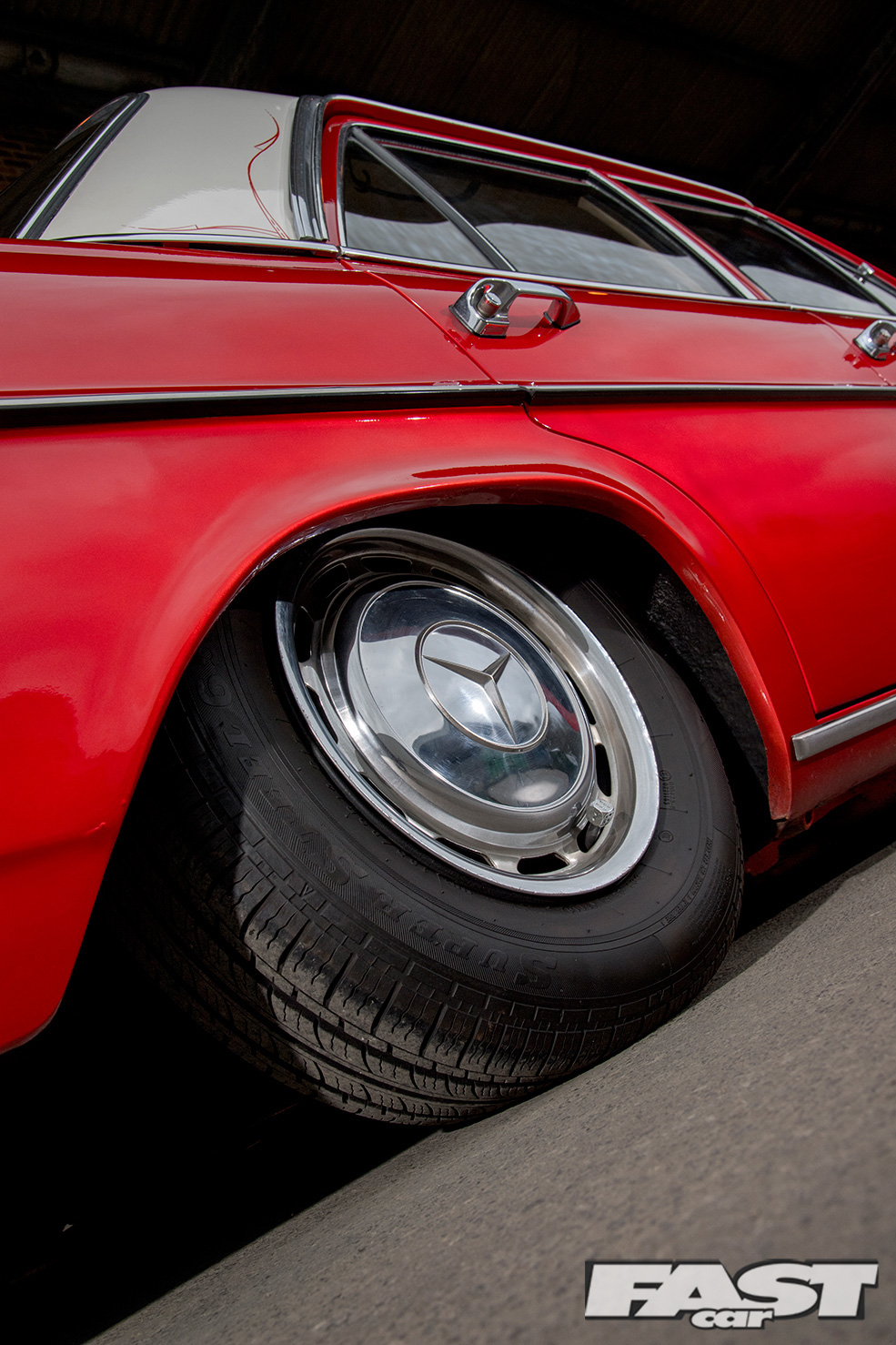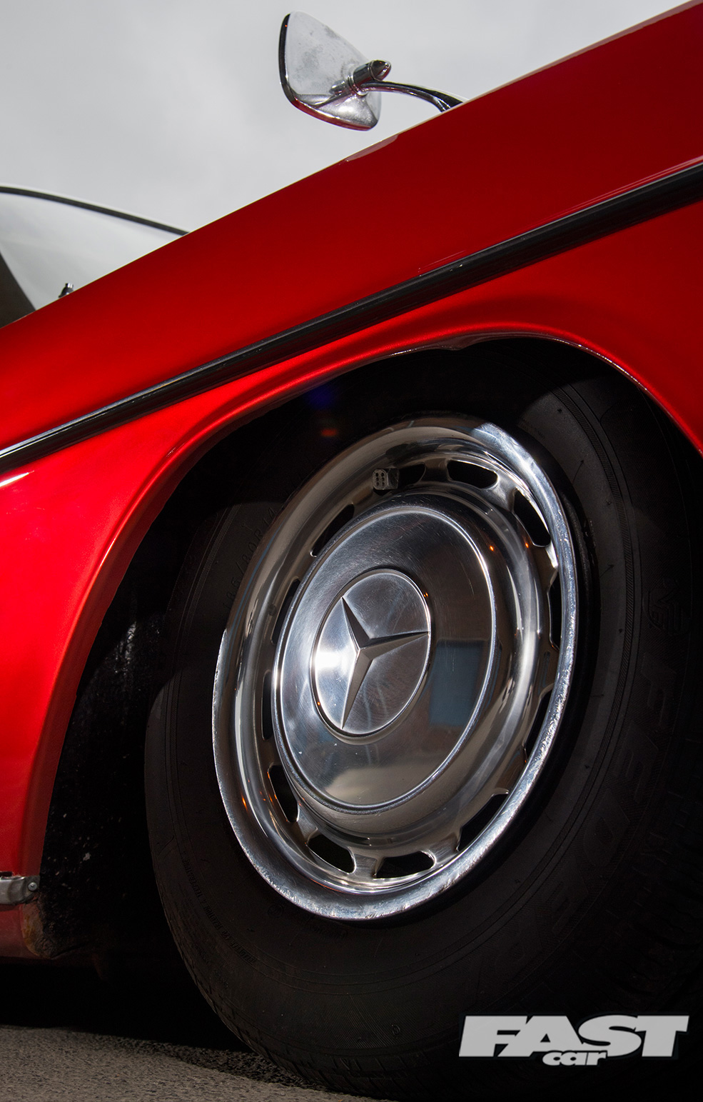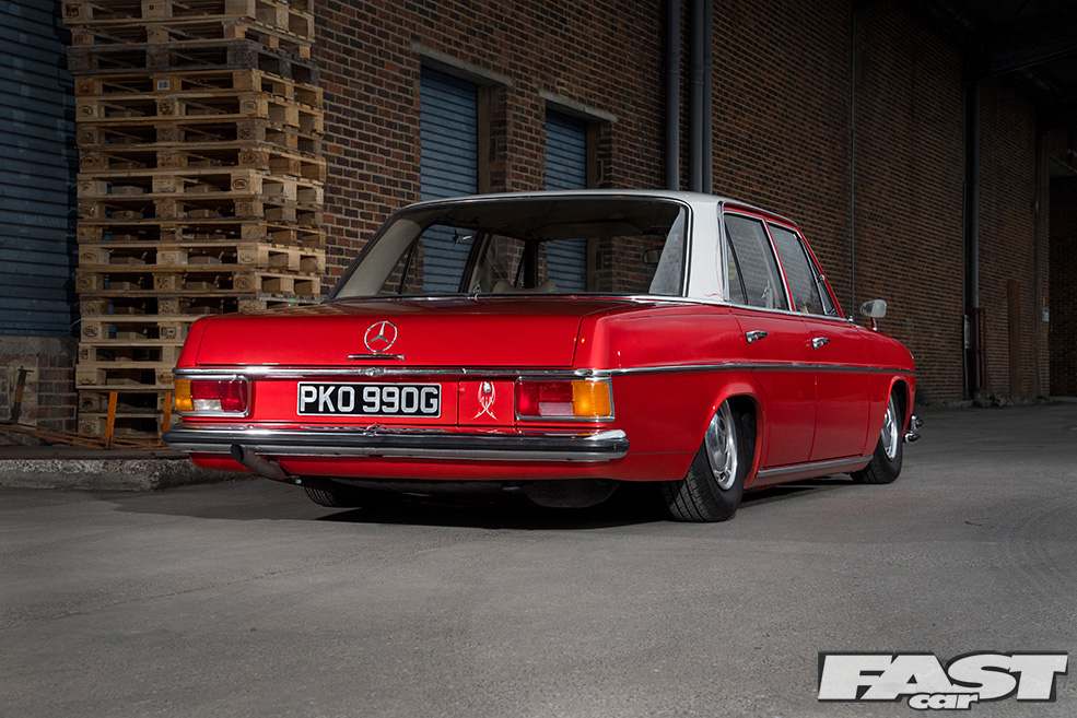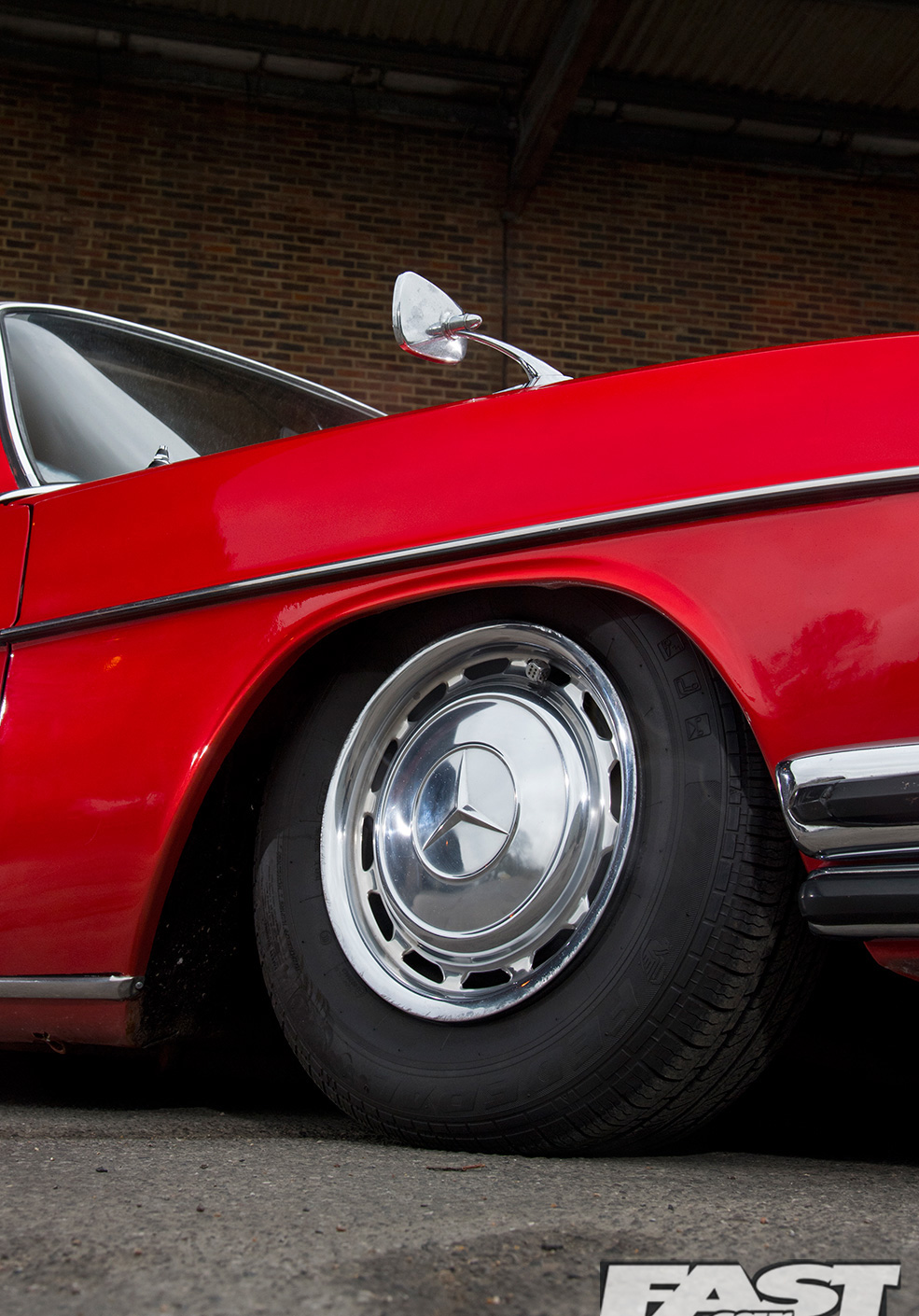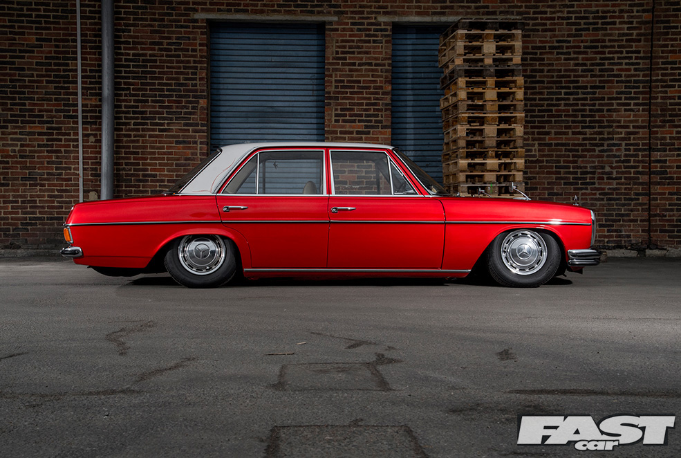 One of James’s key decisions was to run the Merc on air-ride. Naturally you can’t just pick up a kit off the shelf for a ’69 Merc, so Paul cracked open his trusty old toolbox and got busy. “The air suspension mounts were all made at home by my dad, with the rear shocks relocated further on the trailing arms to allow space for the bags,” James explains. “We repainted the shell in the original brown at first, but then decided to paint it again in Renault Flame Red as it’s a bit more vibrant and eye-catching – a bit more of a Chelsea Cruise vibe. Most of the work was done in the winter months, and we did it all ourselves on the driveway with no cover! I’m pretty sure it was the first bagged W114 in the country at the time, and it certainly caused a stir on the scene…”