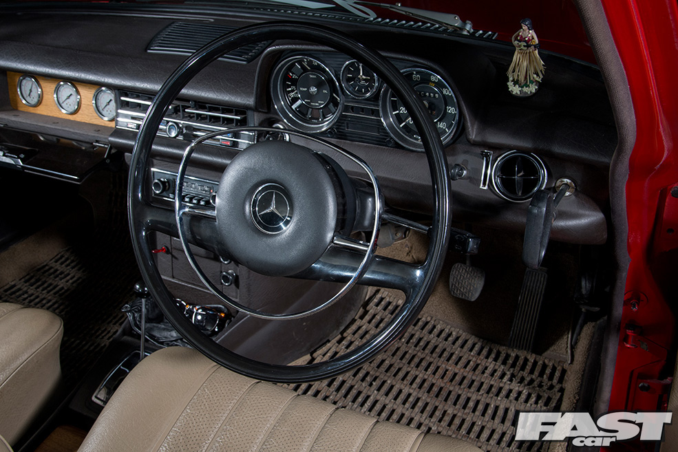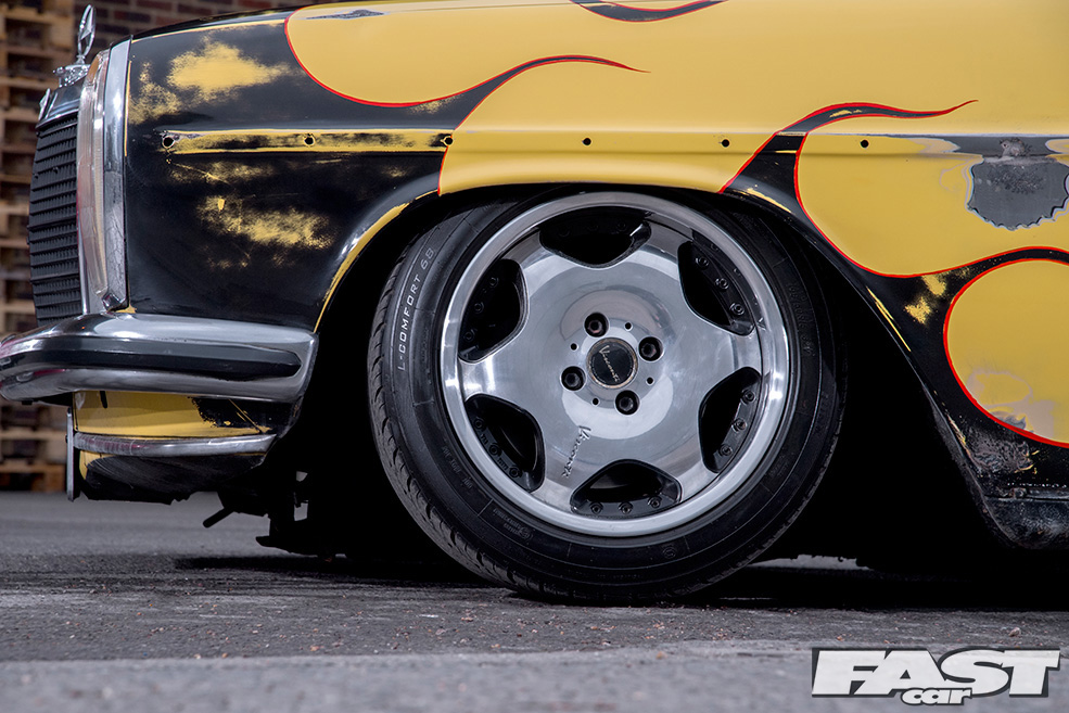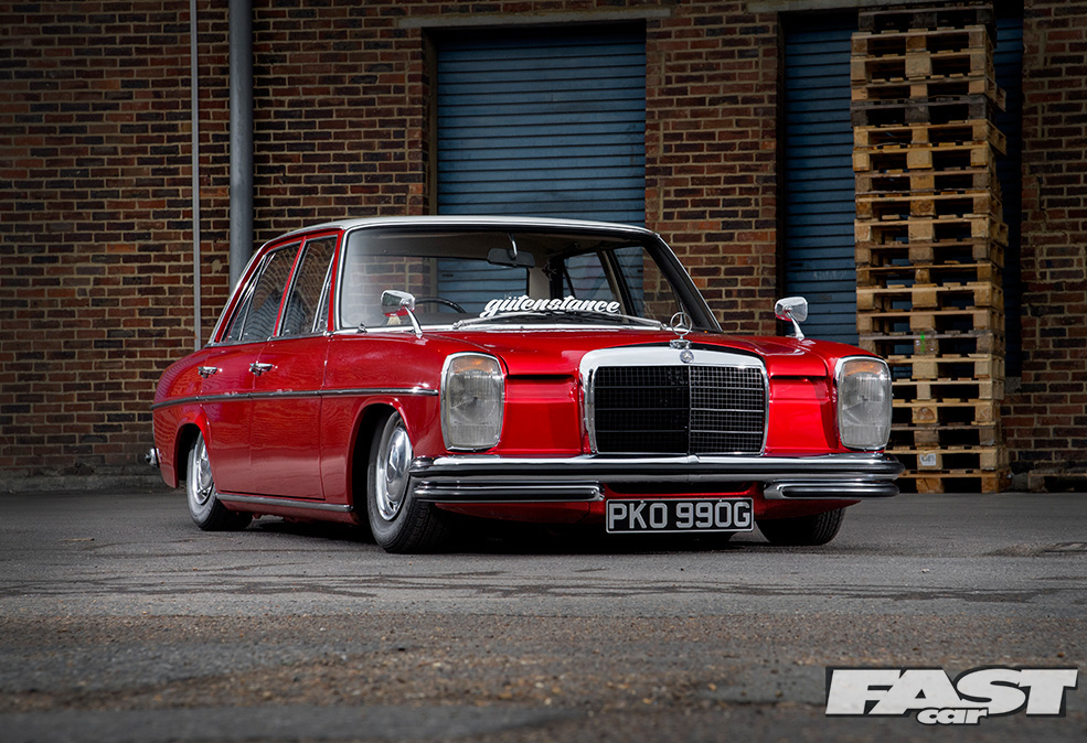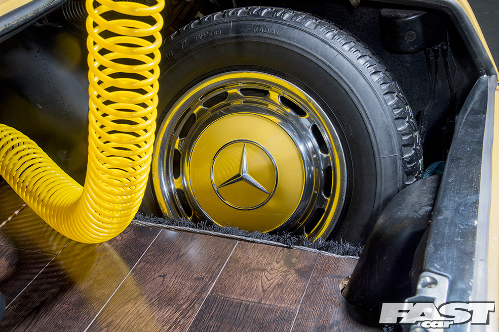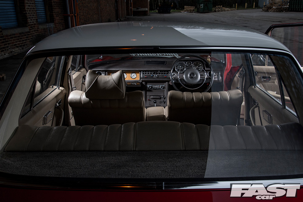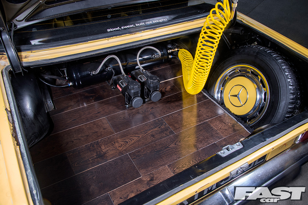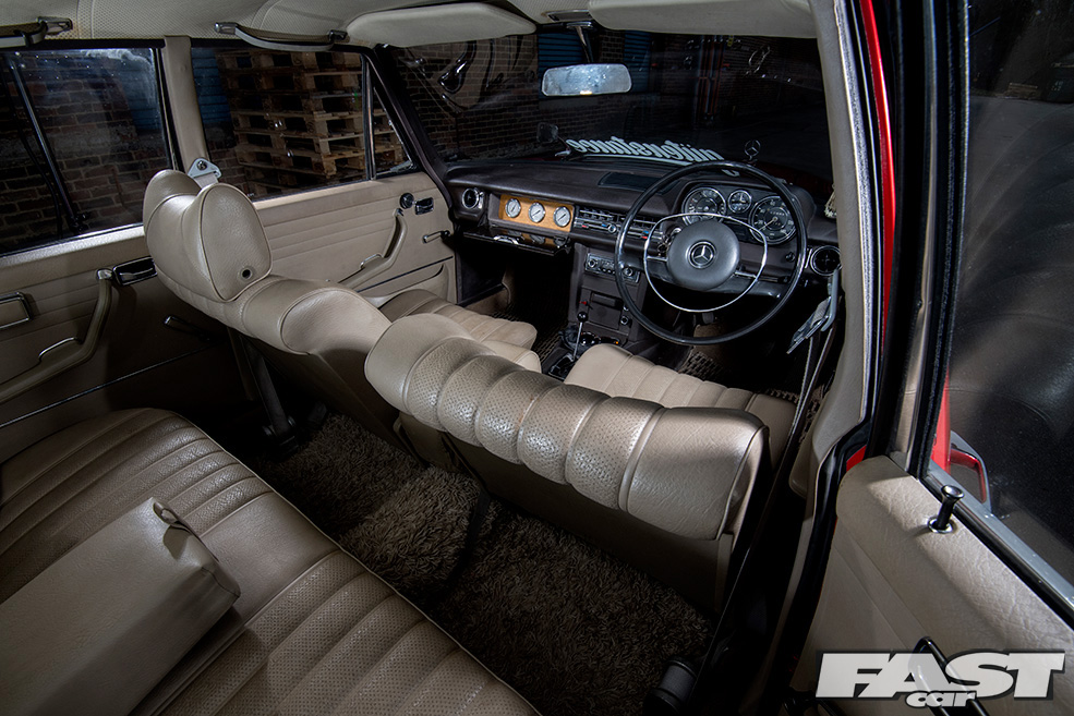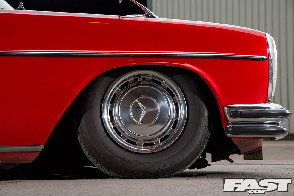 One of James’s key decisions was to run the Merc on air-ride. Naturally you can’t just pick up a kit off the shelf for a ’69 Merc, so Paul cracked open his trusty old toolbox and got busy. “The air suspension mounts were all made at home by my dad, with the rear shocks relocated further on the trailing arms to allow space for the bags,” James explains. “We repainted the shell in the original brown at first, but then decided to paint it again in Renault Flame Red as it’s a bit more vibrant and eye-catching – a bit more of a Chelsea Cruise vibe. Most of the work was done in the winter months, and we did it all ourselves on the driveway with no cover! I’m pretty sure it was the first bagged W114 in the country at the time, and it certainly caused a stir on the scene…”