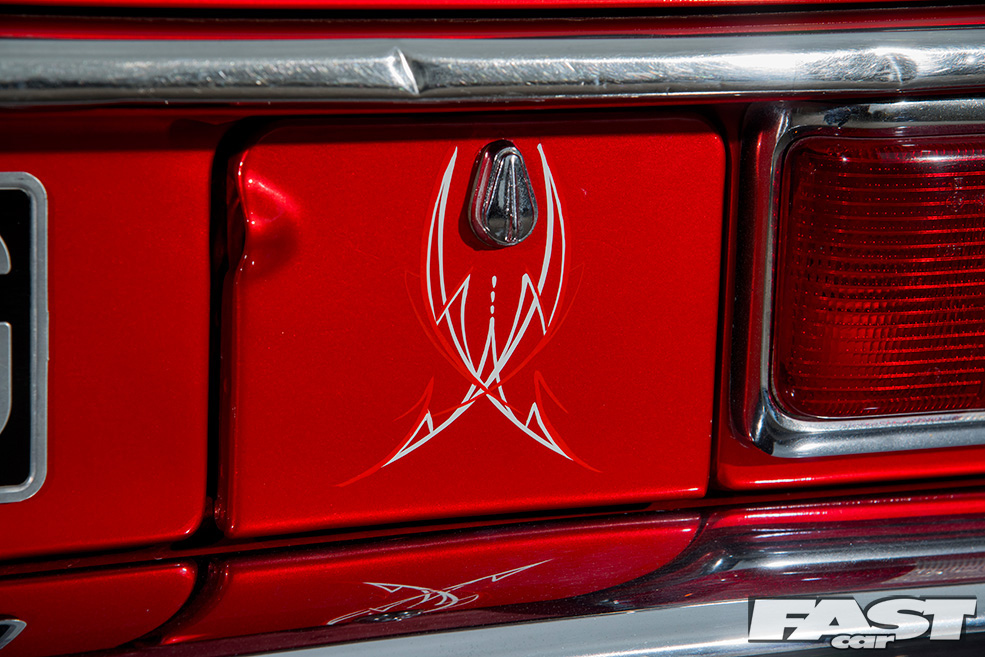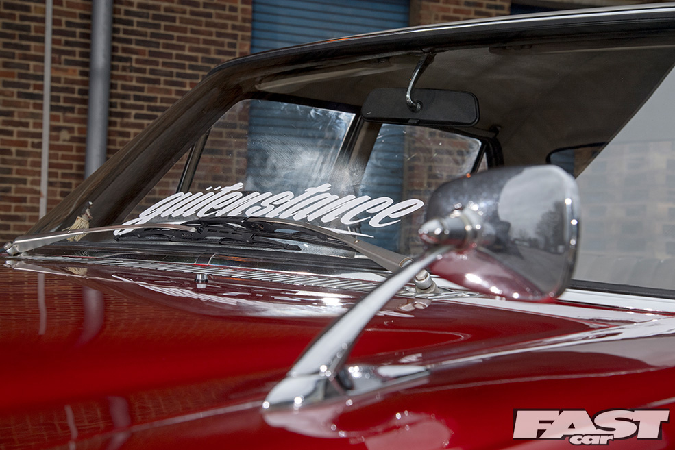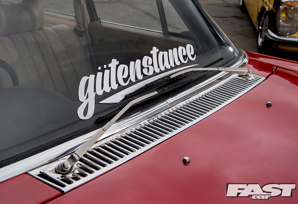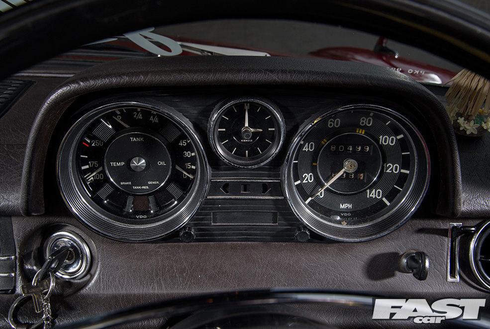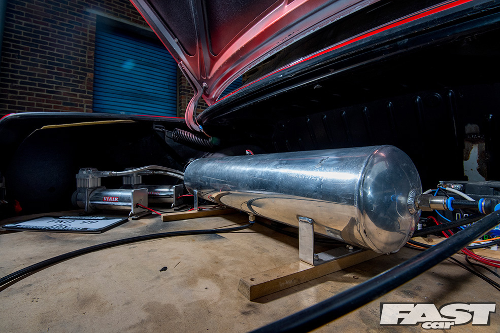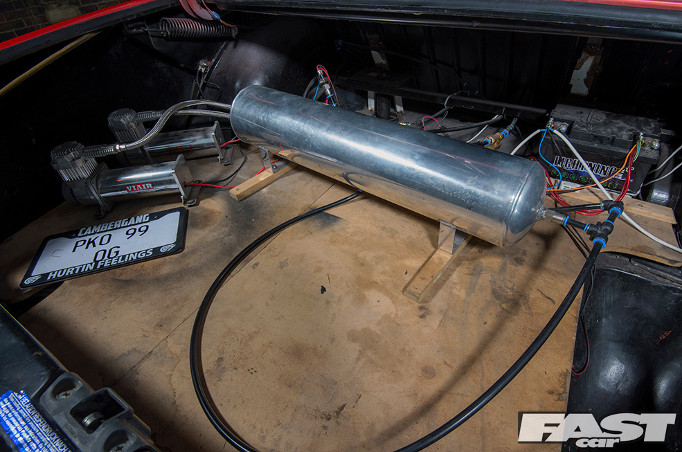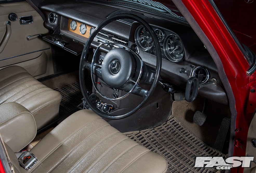 One of James’s key decisions was to run the Merc on air-ride. Naturally you can’t just pick up a kit off the shelf for a ’69 Merc, so Paul cracked open his trusty old toolbox and got busy. “The air suspension mounts were all made at home by my dad, with the rear shocks relocated further on the trailing arms to allow space for the bags,” James explains. “We repainted the shell in the original brown at first, but then decided to paint it again in Renault Flame Red as it’s a bit more vibrant and eye-catching – a bit more of a Chelsea Cruise vibe. Most of the work was done in the winter months, and we did it all ourselves on the driveway with no cover! I’m pretty sure it was the first bagged W114 in the country at the time, and it certainly caused a stir on the scene…”